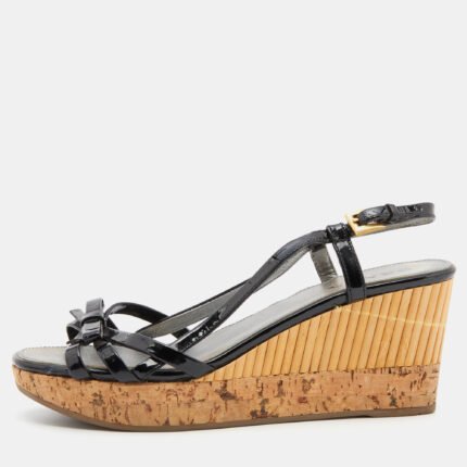 Prada Black Patent Leather Strappy Bow Platform Wedge Sandals Size 36