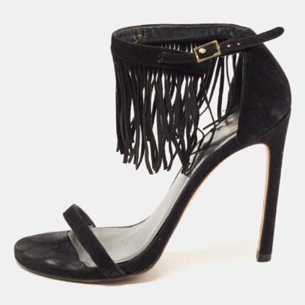 Stuart Weitzman Black Suede Love Fringe Ankle Strap Sandals Size 37.5