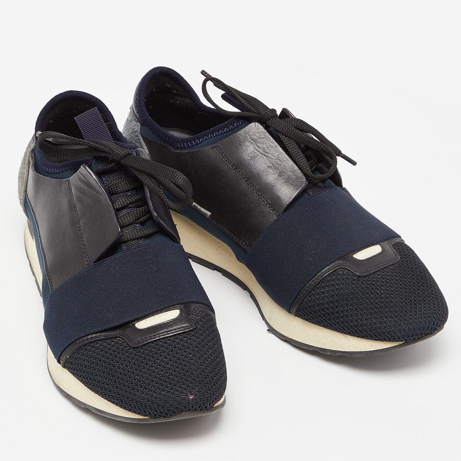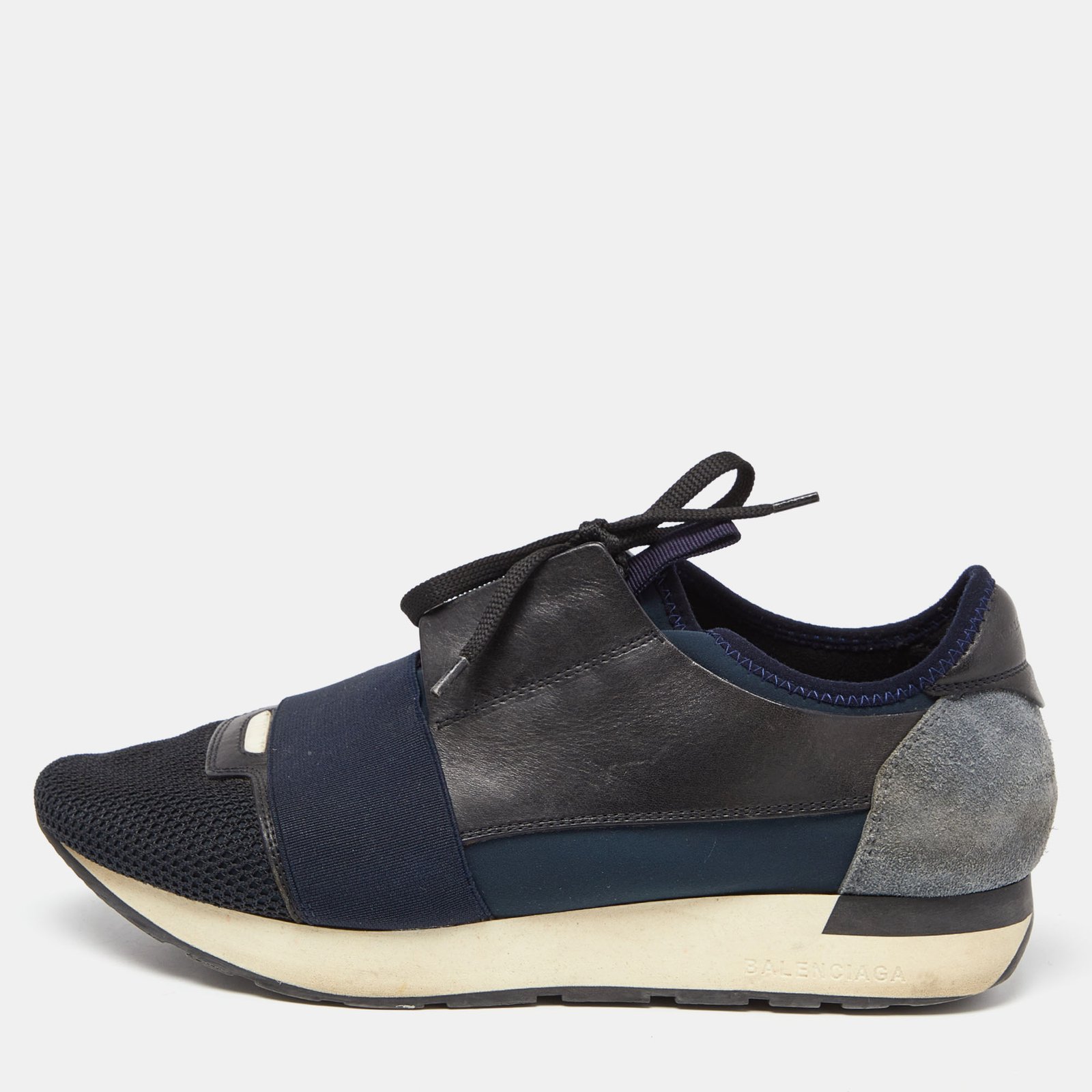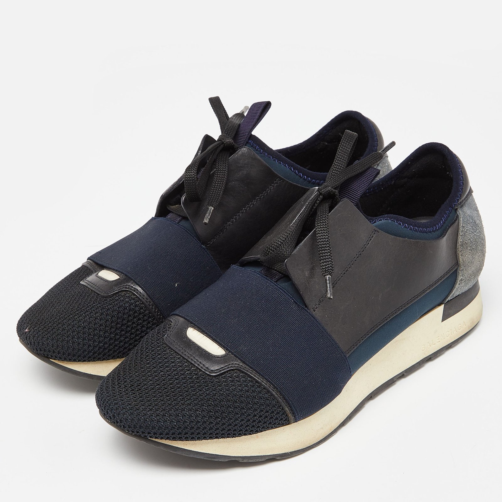 Balenciaga Black/Navy Blue Leather and Mesh Race Runner Sneakers Size 39 - Image 1