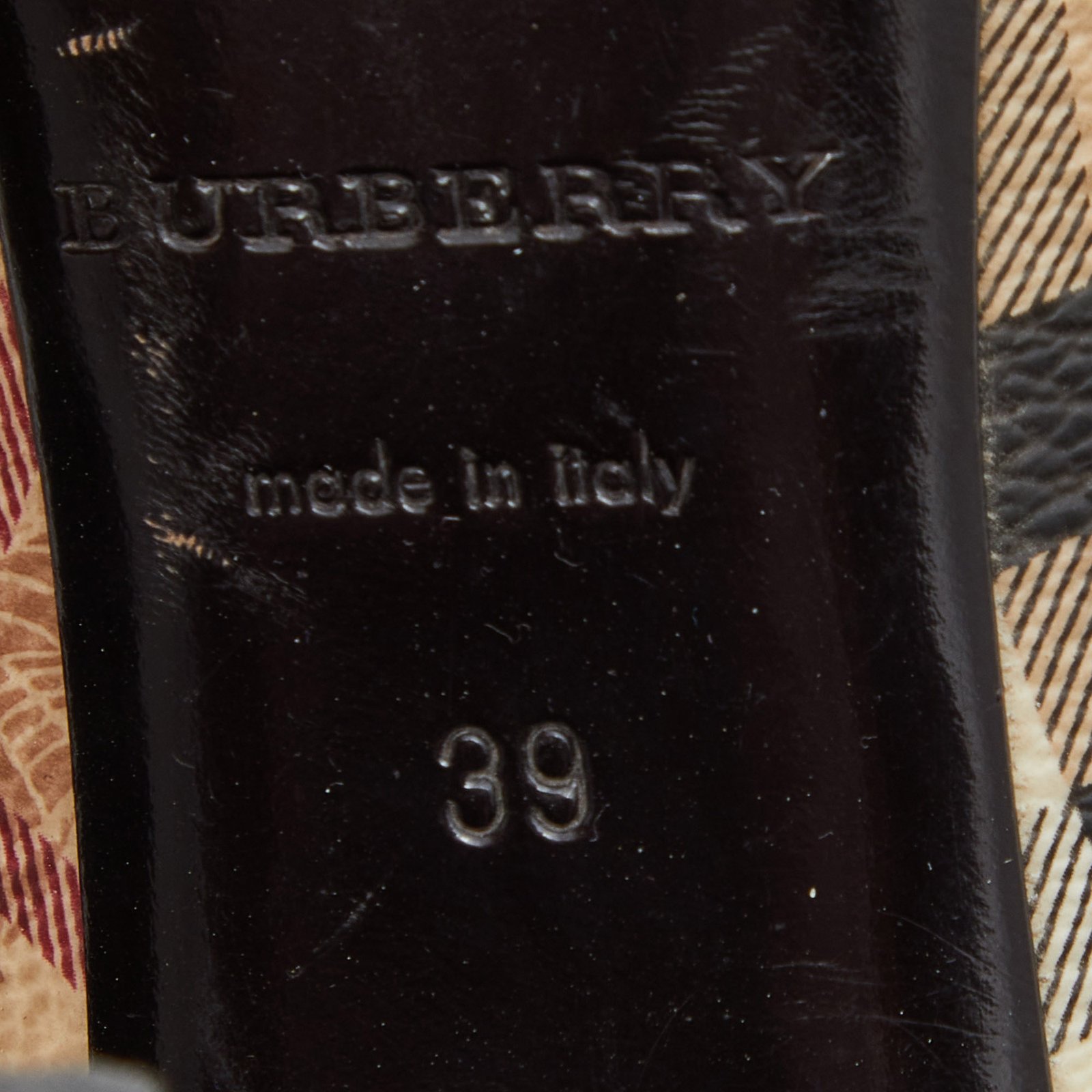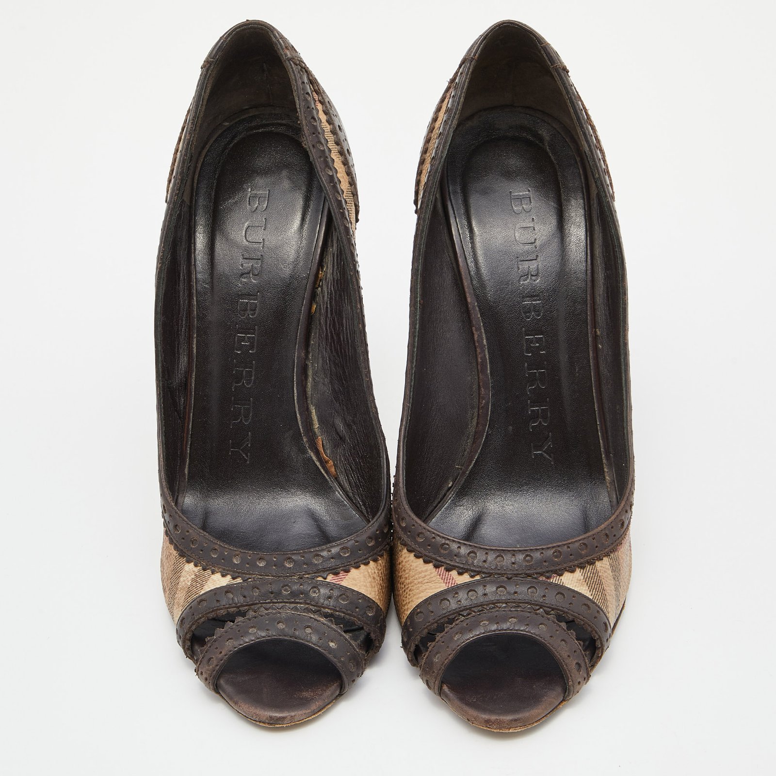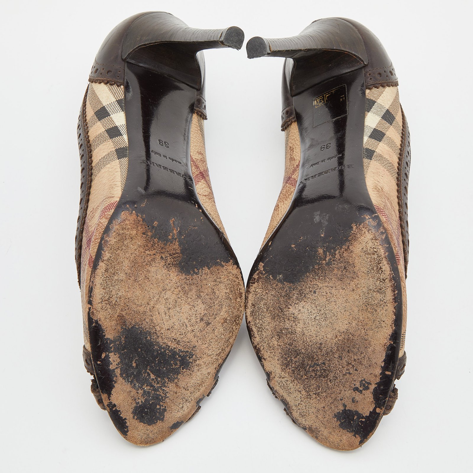 Burberry Beige/Brown Haymarket Check Canvas and Brogue Leather Peep Toe Pumps Size 39