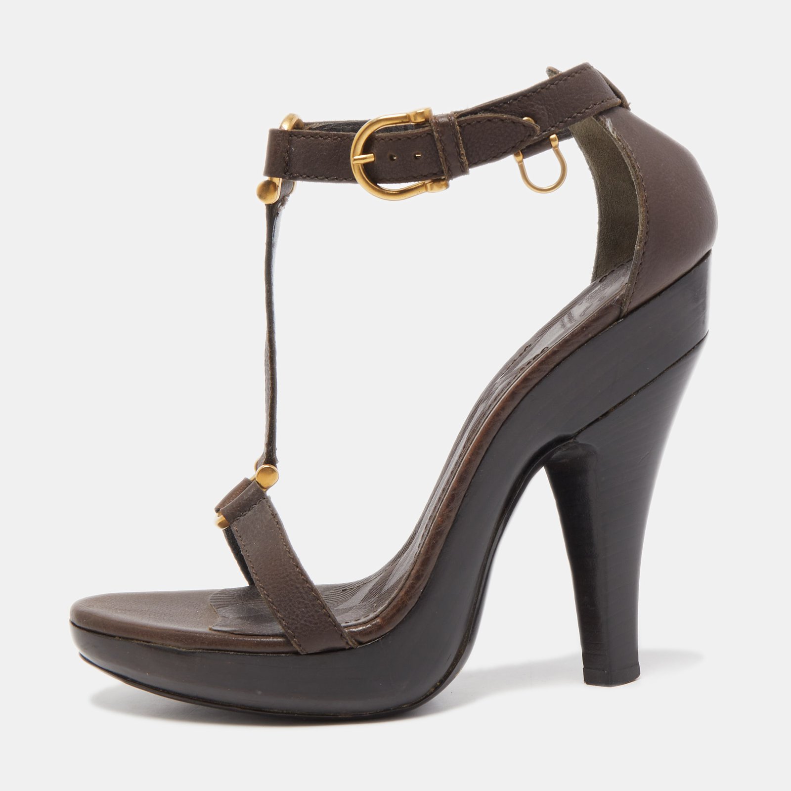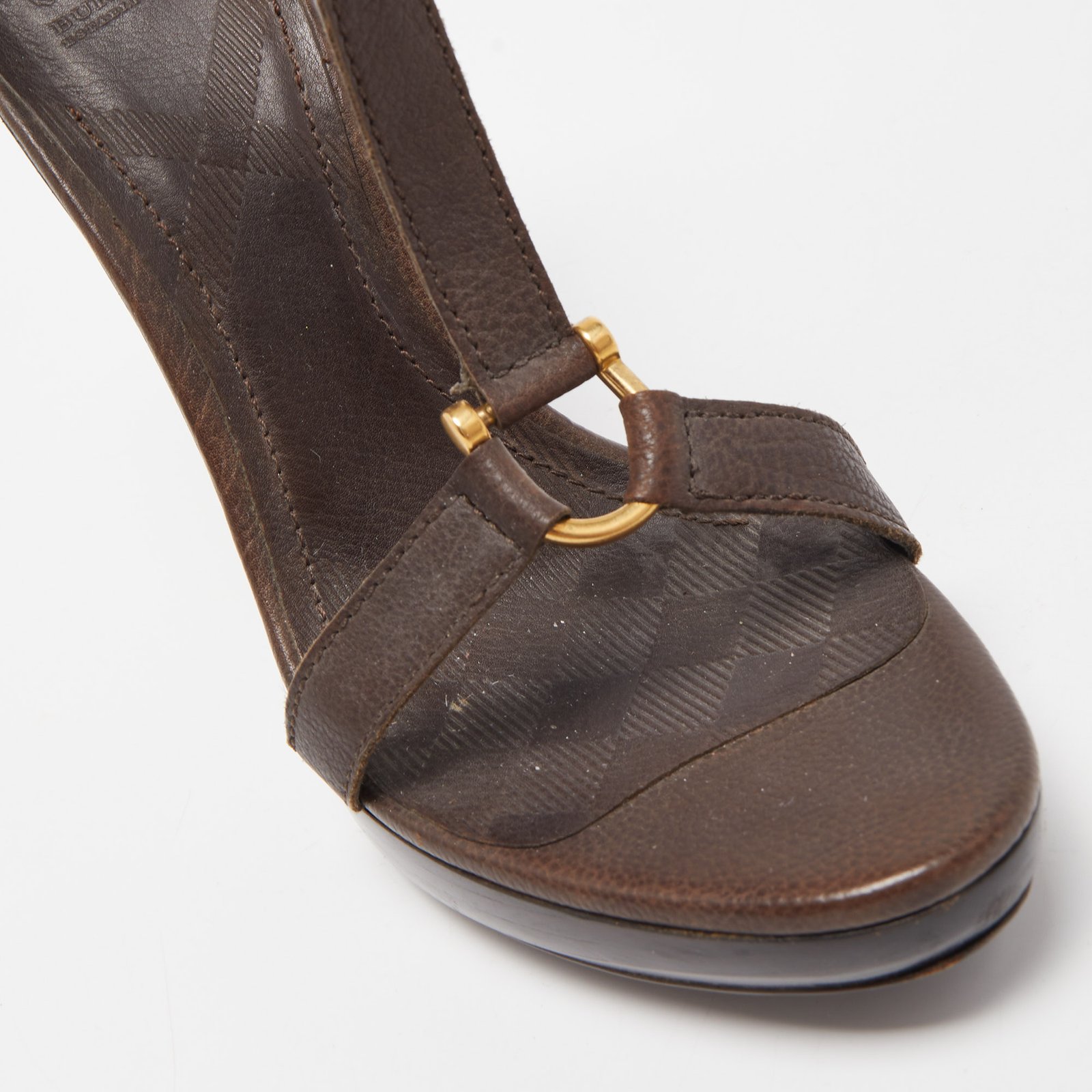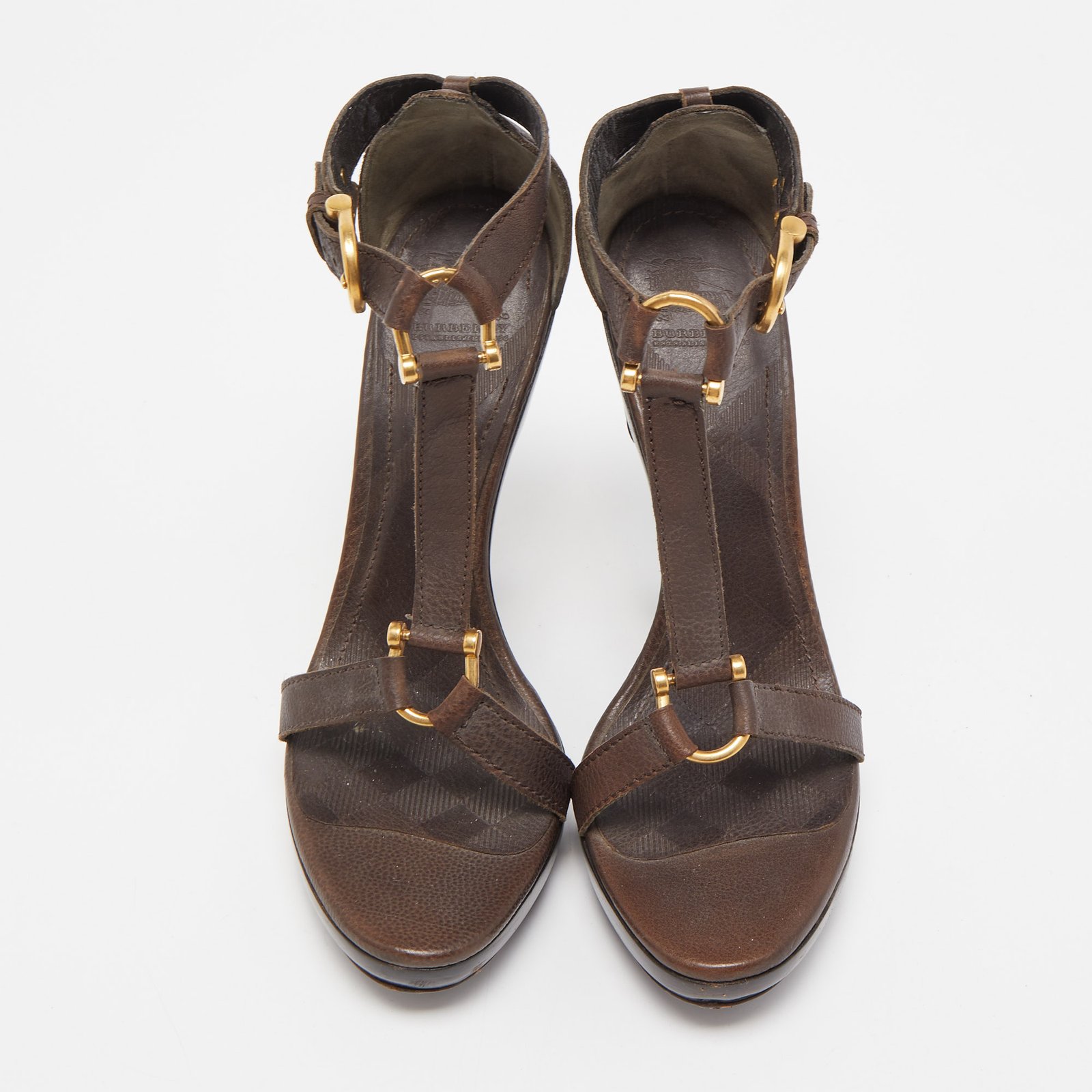 Burberry Brown Leather T Ankle Strap Platform Sandals Size 38