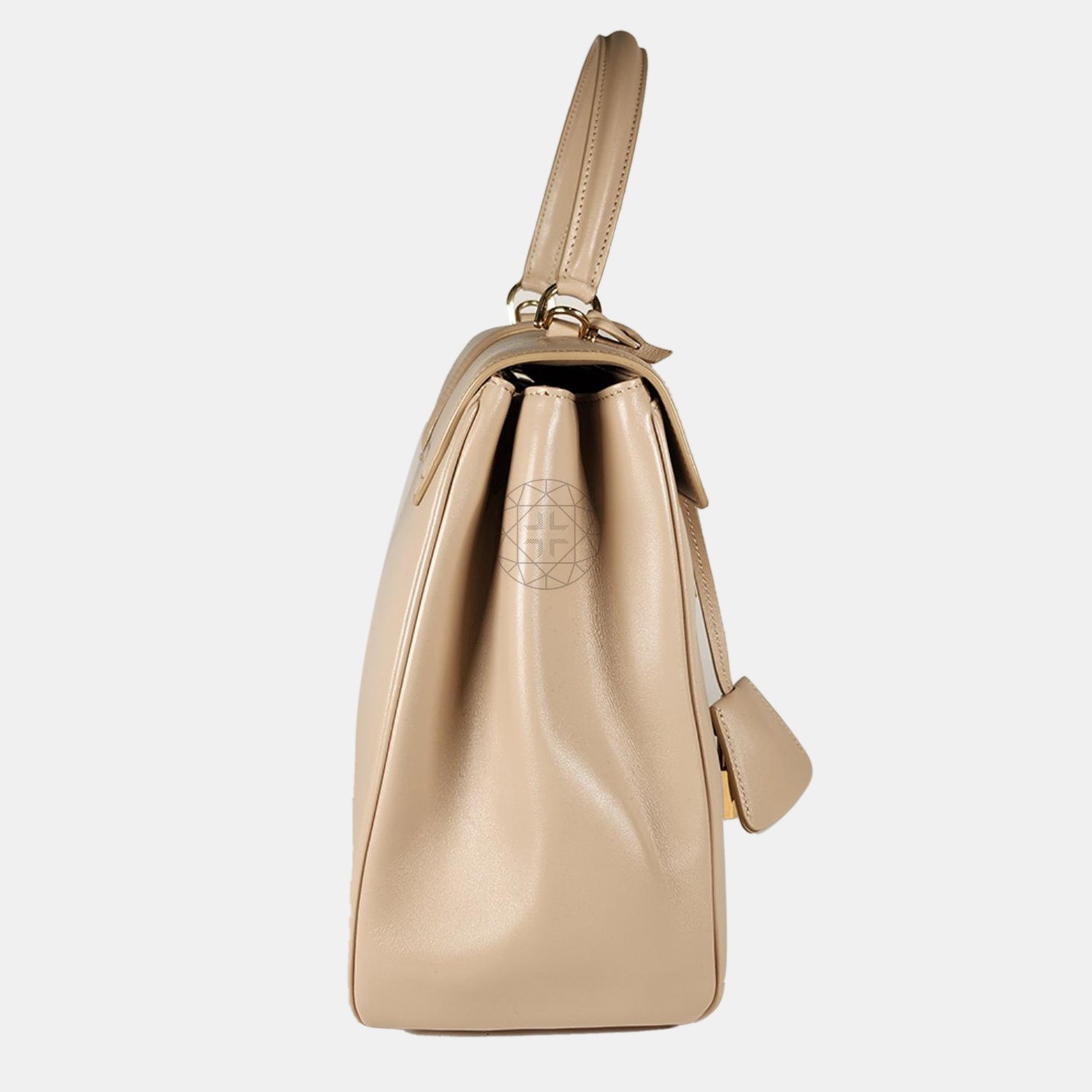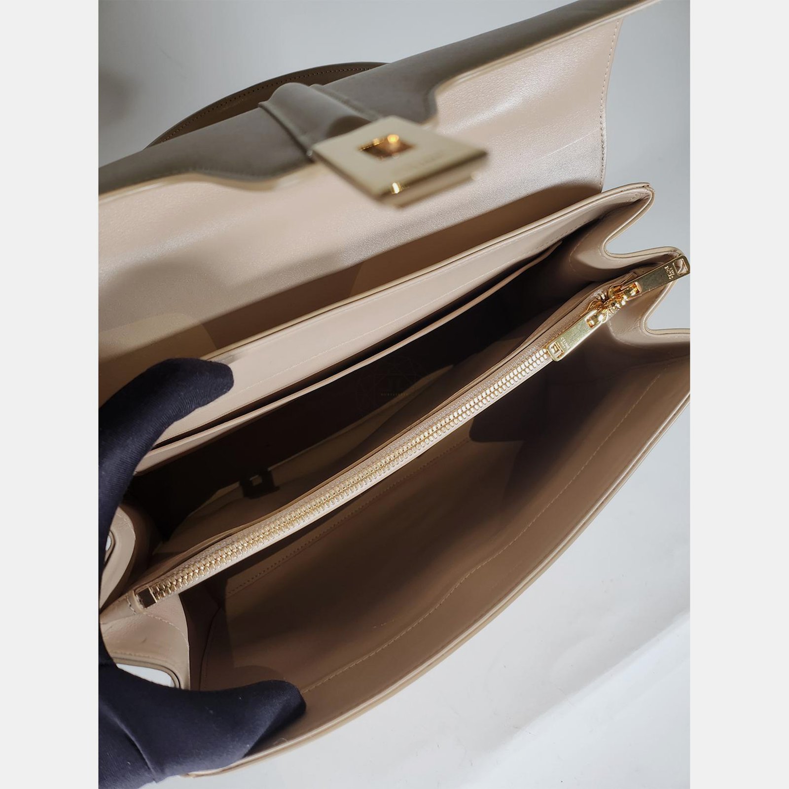 Faint press marks observed. Faint scratches on bottom studs. Black stains observed on the corners of the bag.