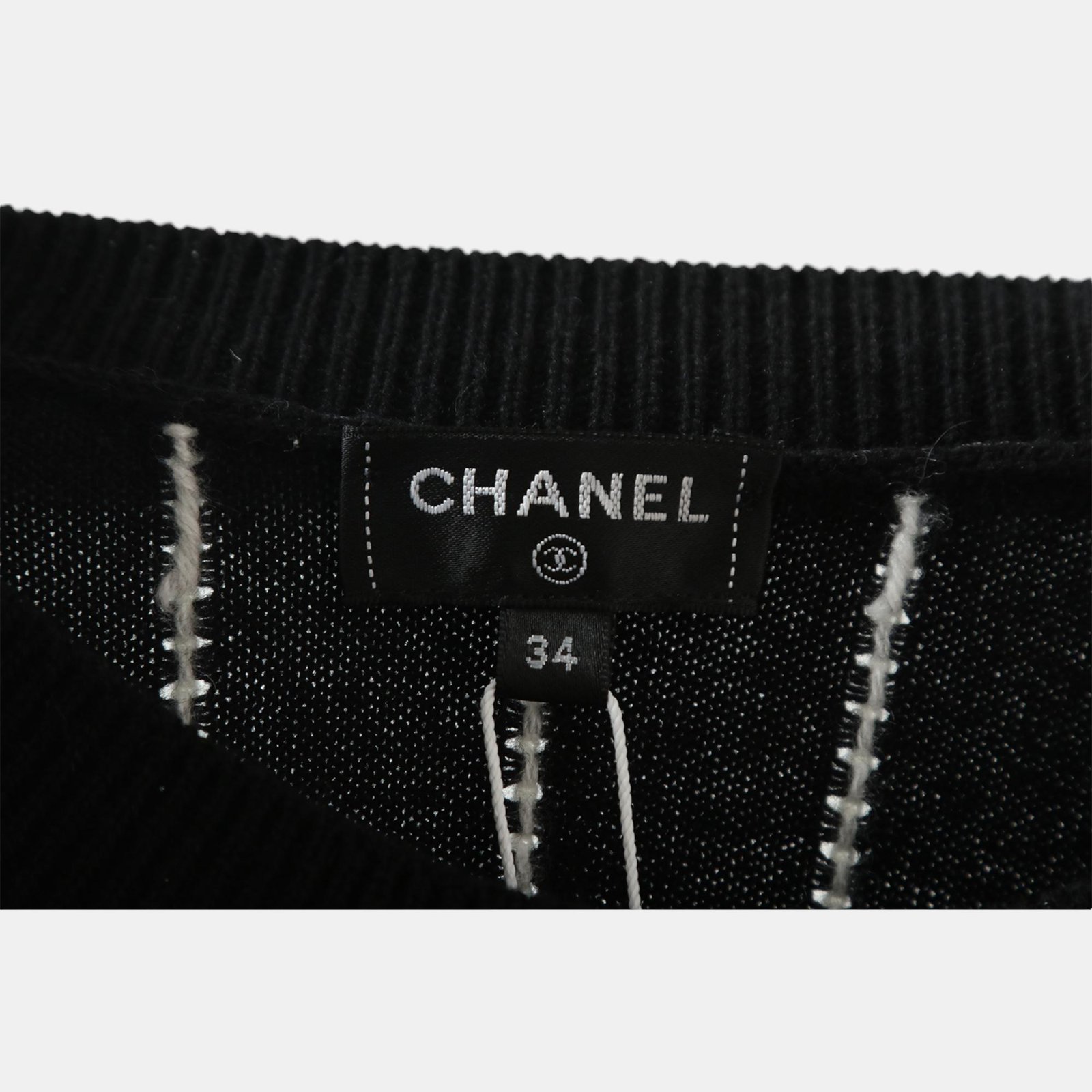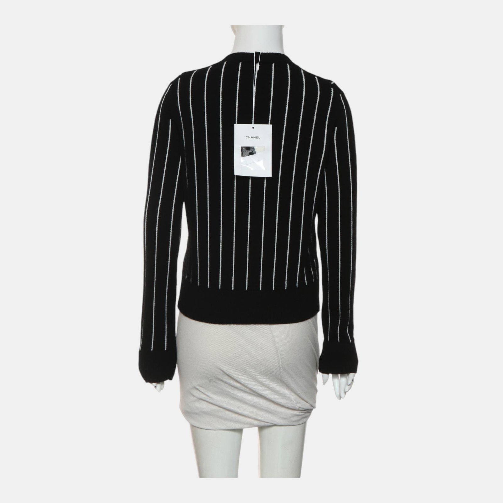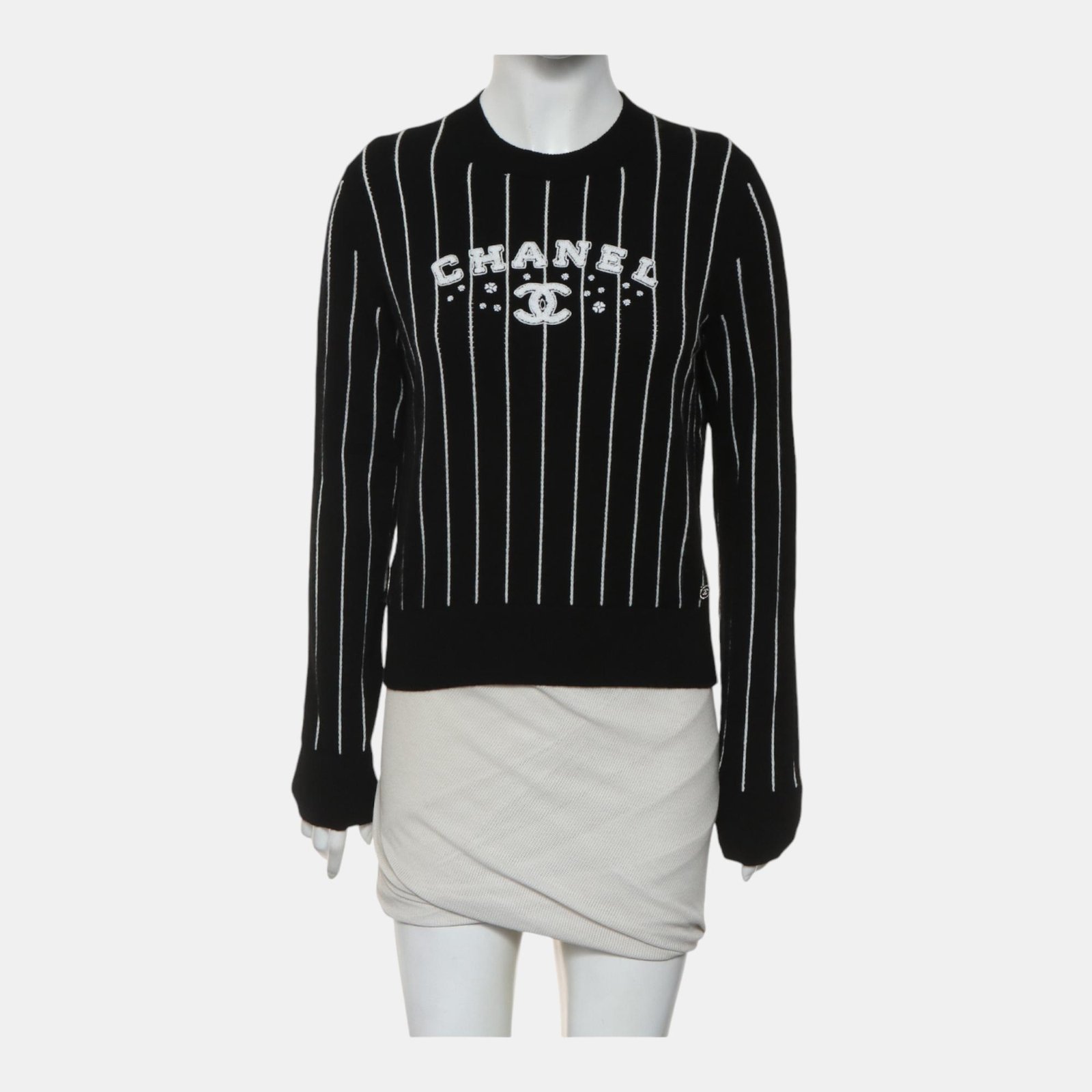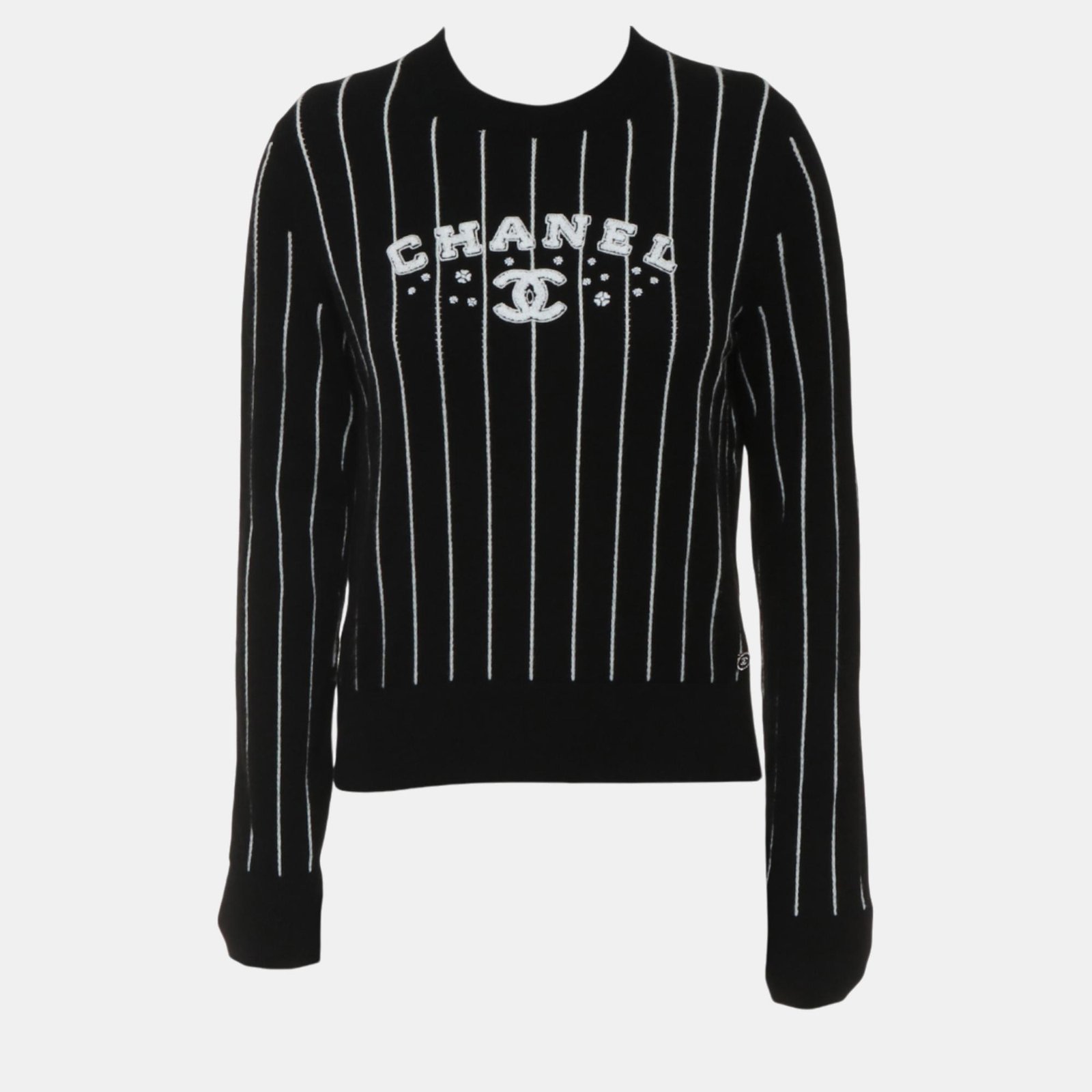 Chanel Black Crew Neck Stripes Logo Sweater S