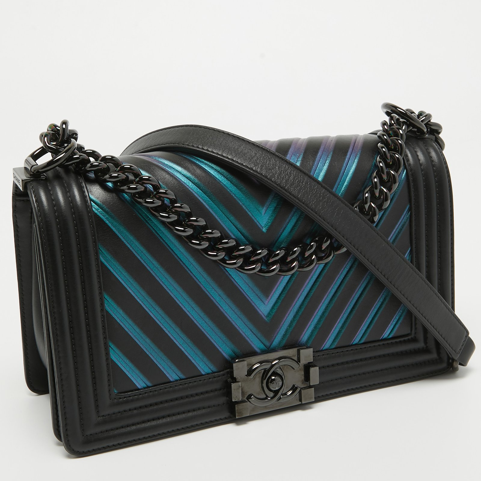 Chanel Black/Holographic Chevron Leather Medium Boy Flap Bag