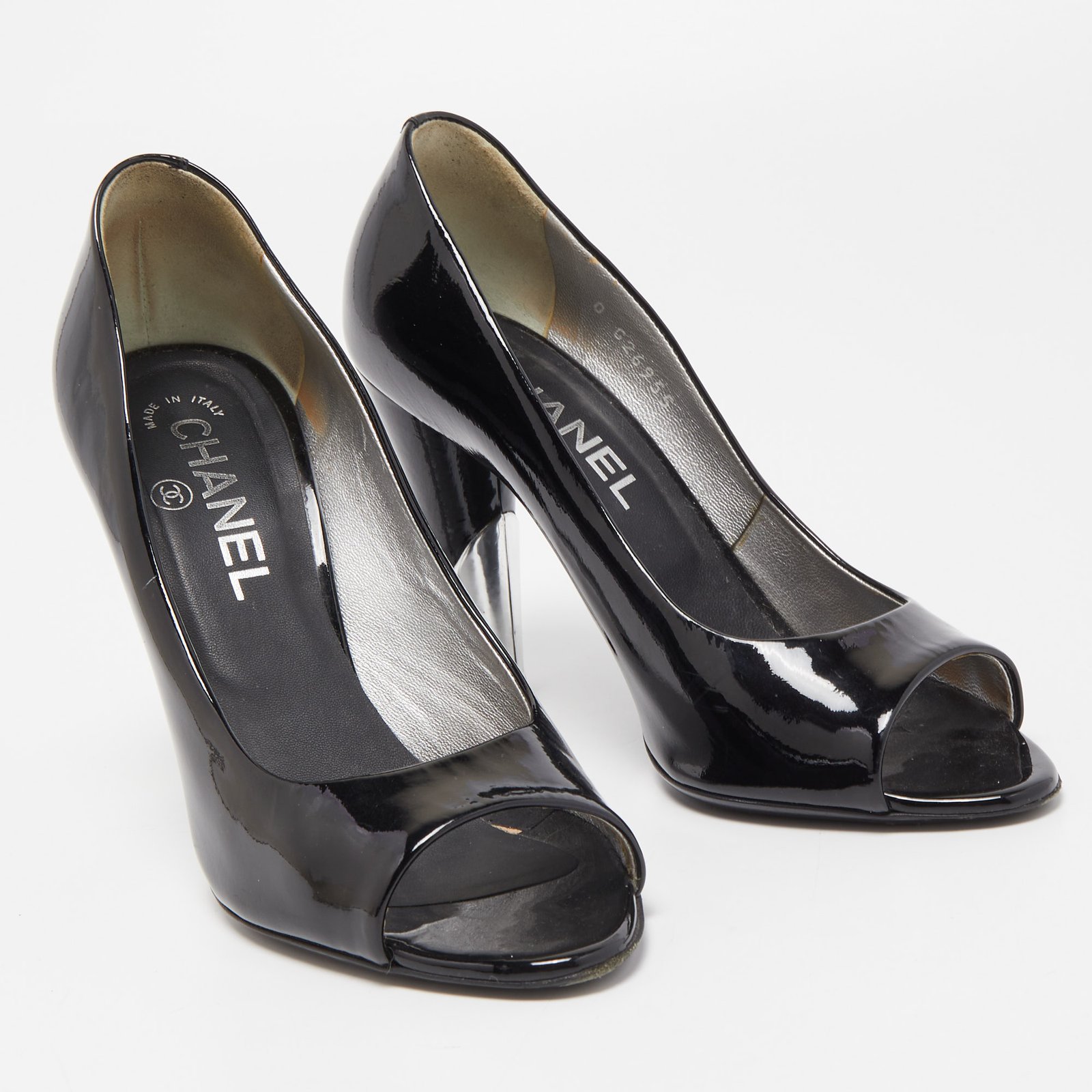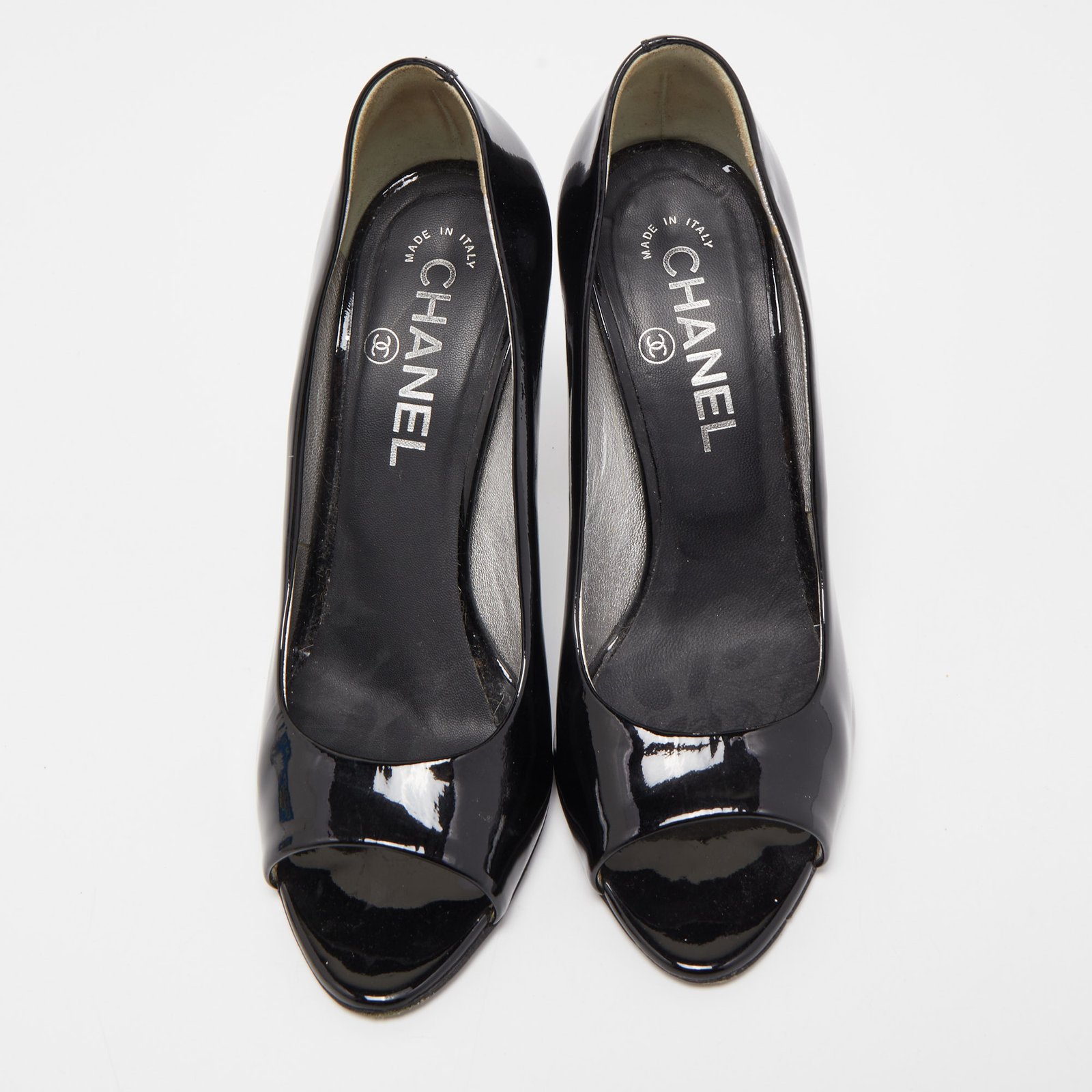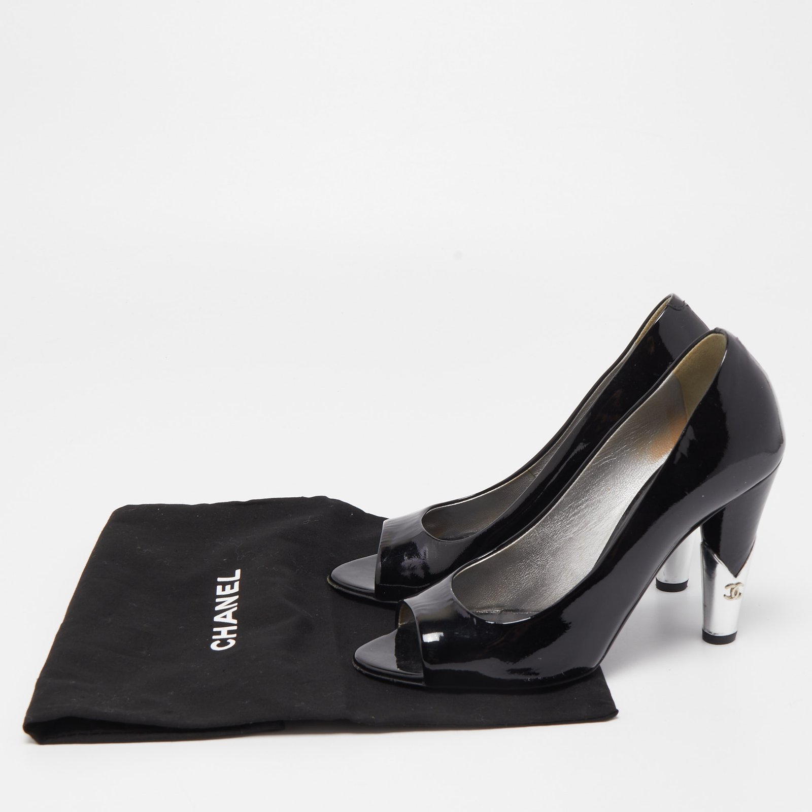 Chanel Black Patent Leather CC Peep Toe Pumps Size 36.5