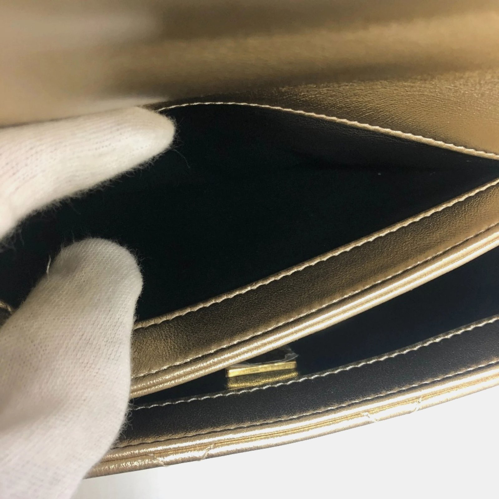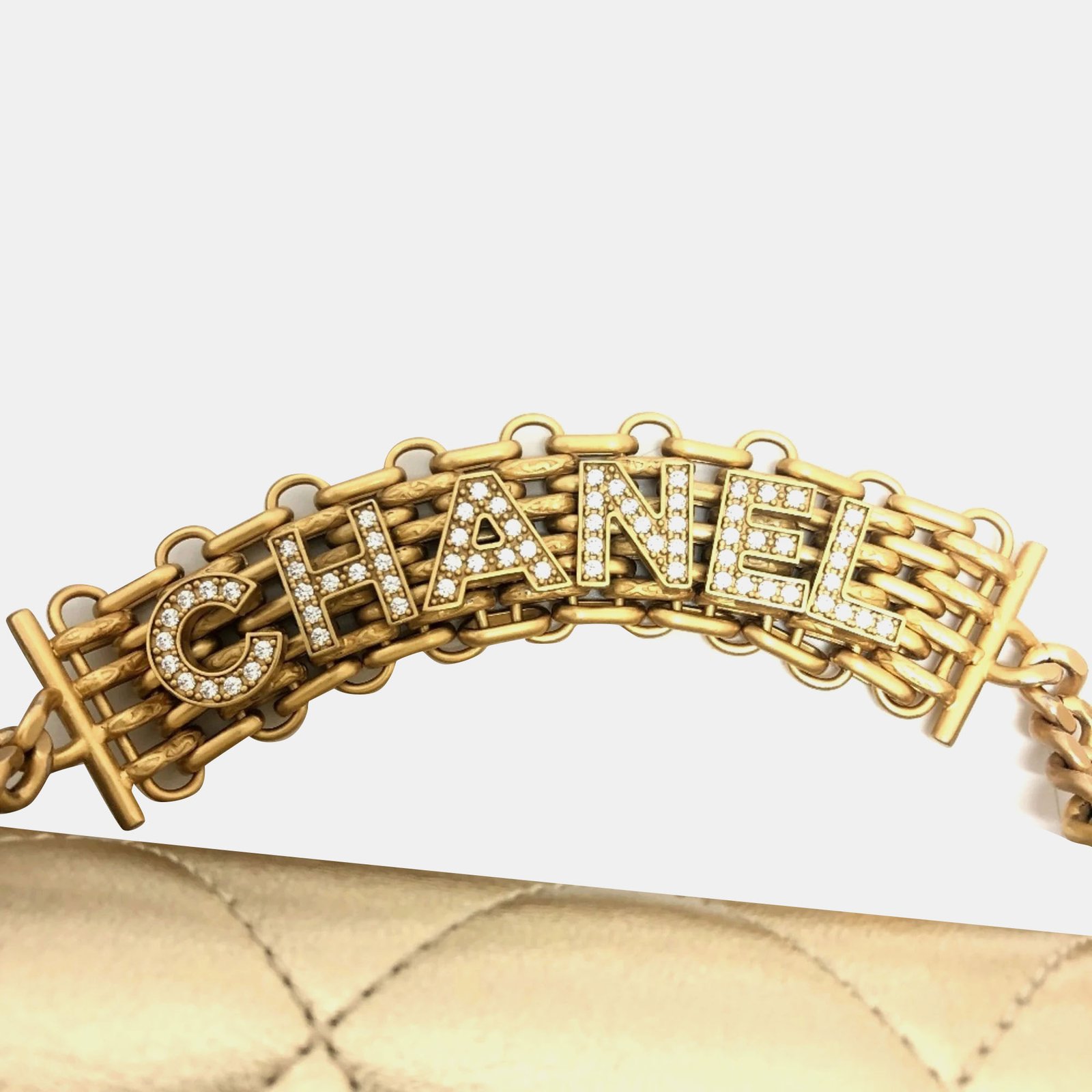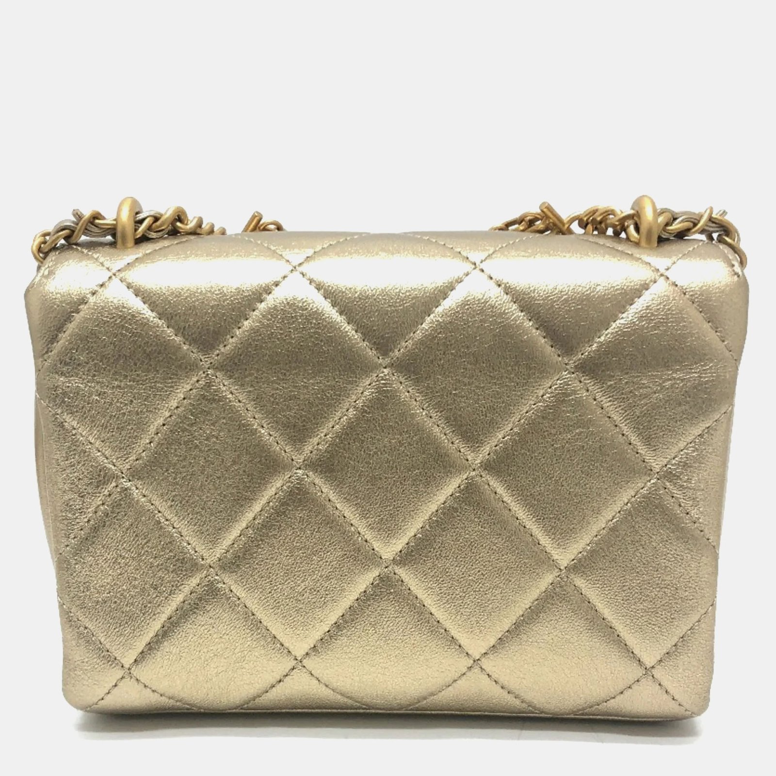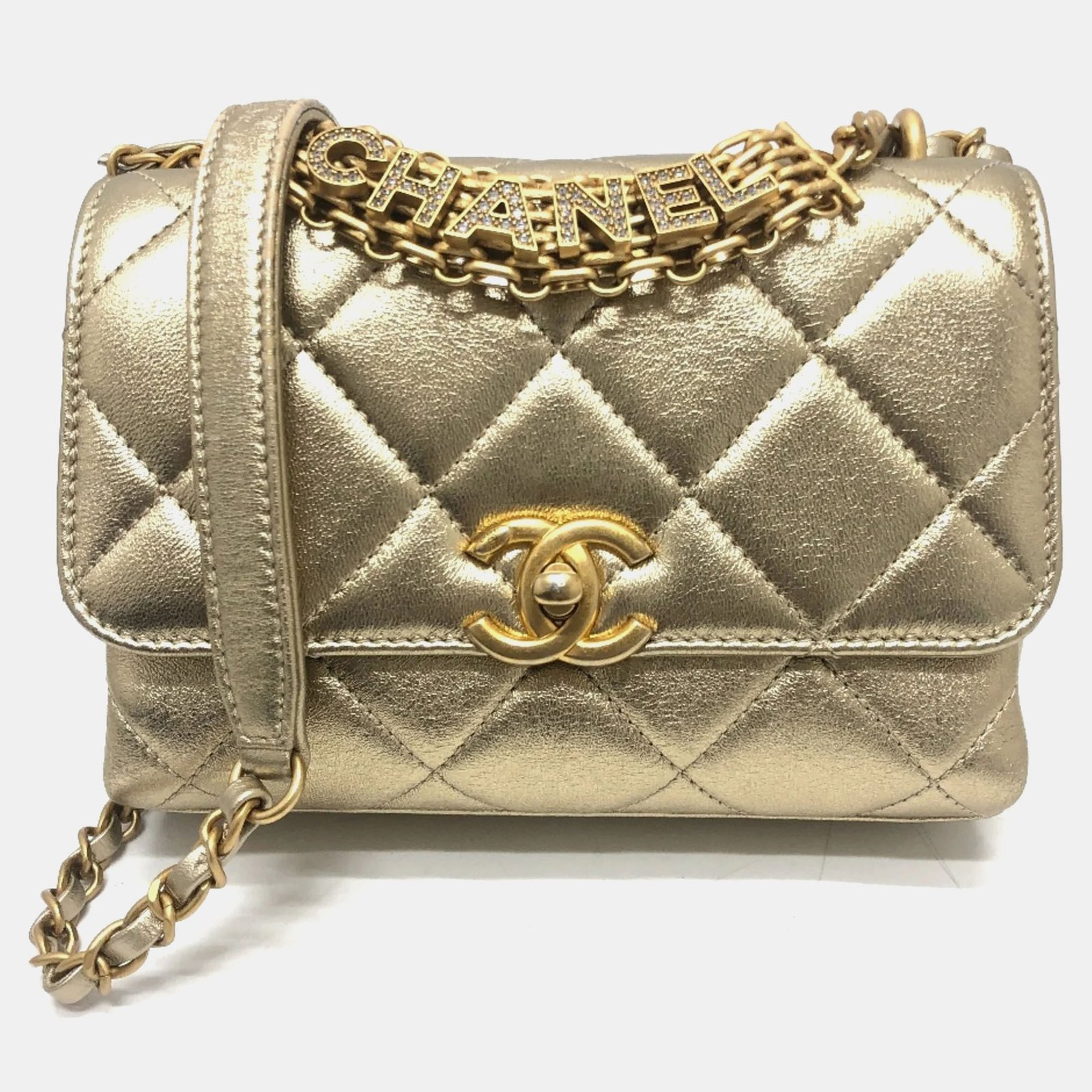 Chanel Gold Quilted Lambskin Mini Crystal Logo Letters Chain Handle Flap Bag
