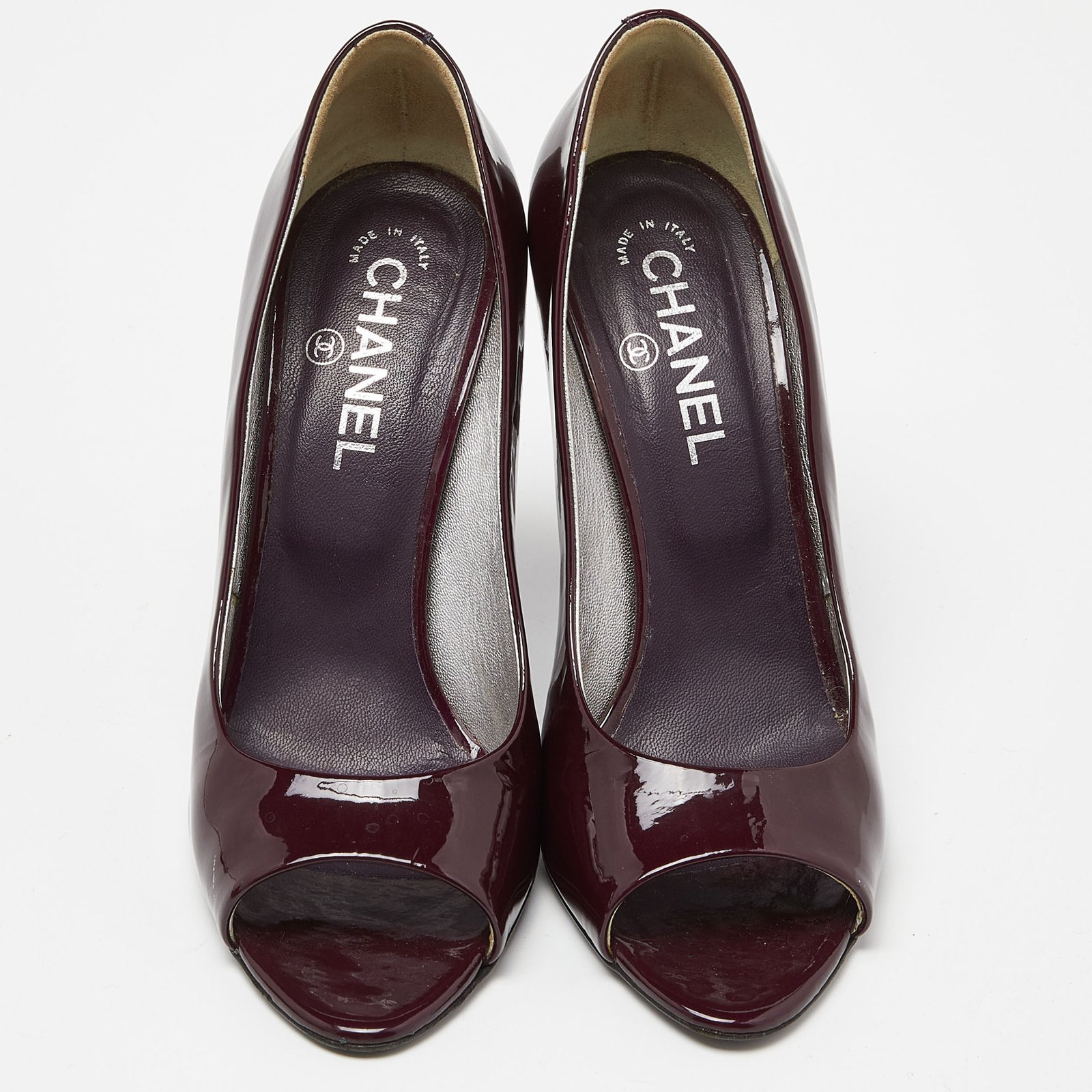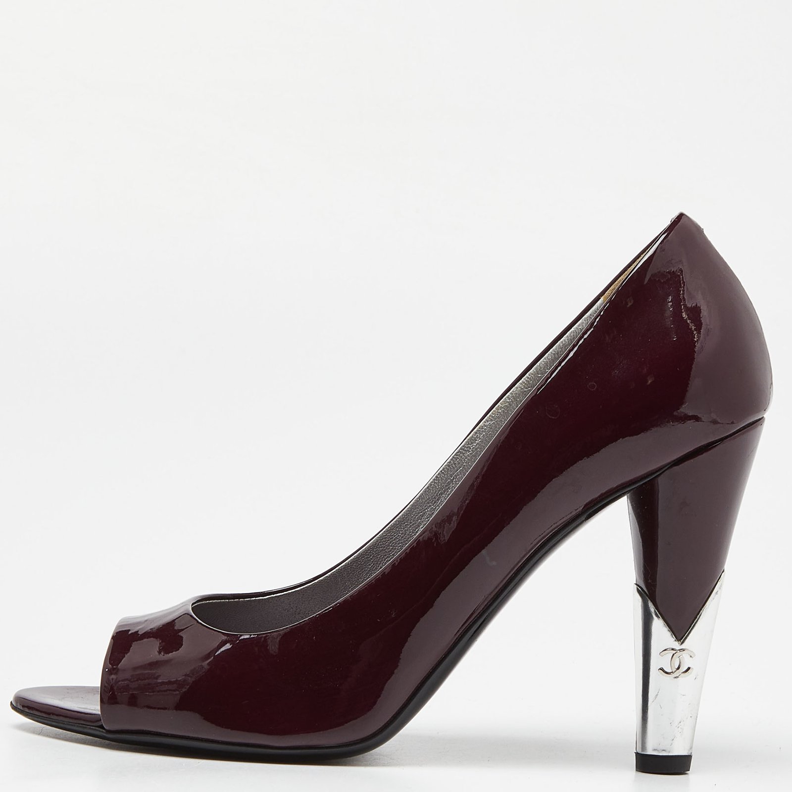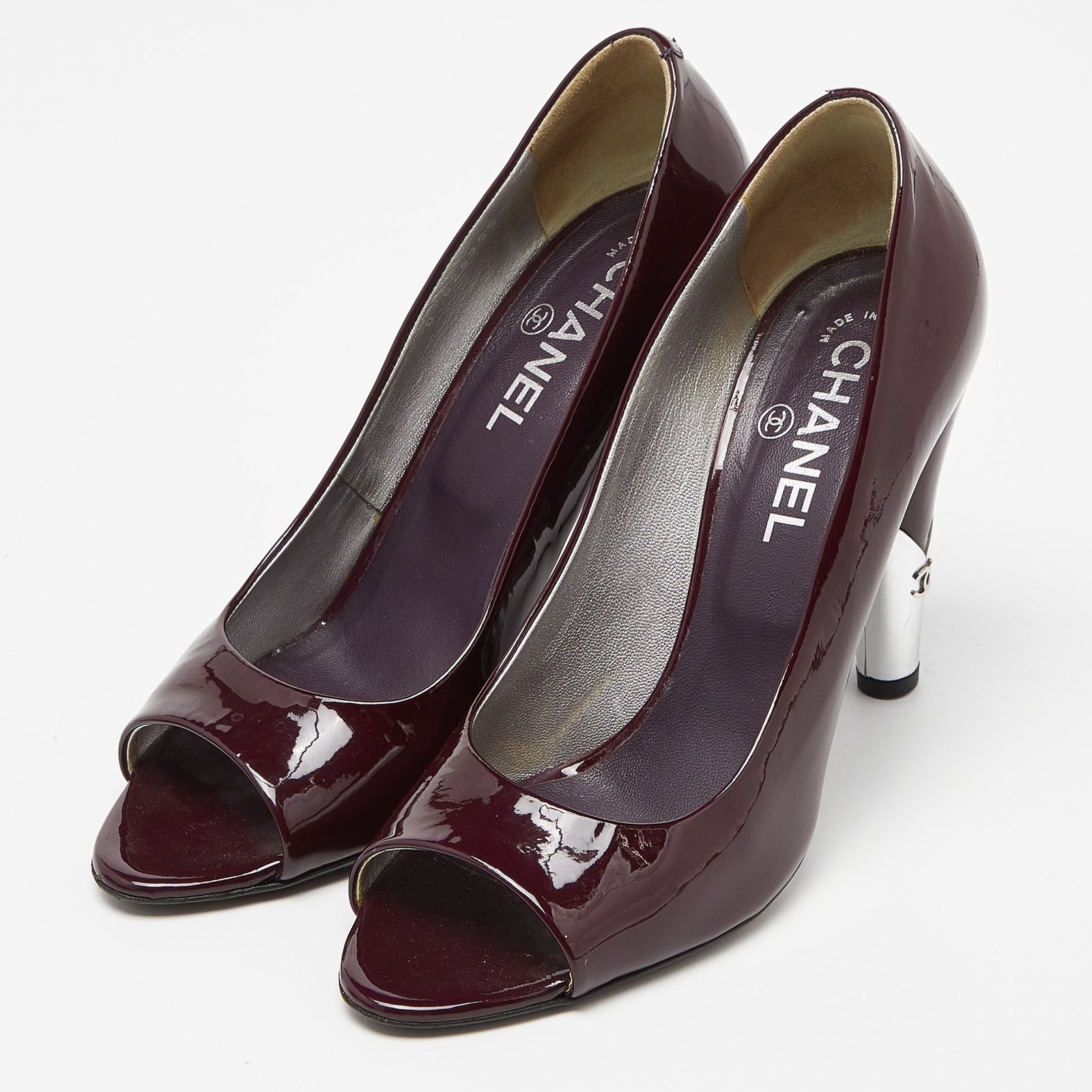 Chanel Purple/Silver Patent Leather Peep Toe CC Heel Pumps Size 39.5