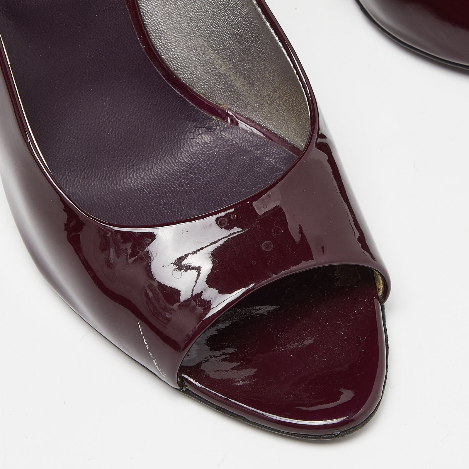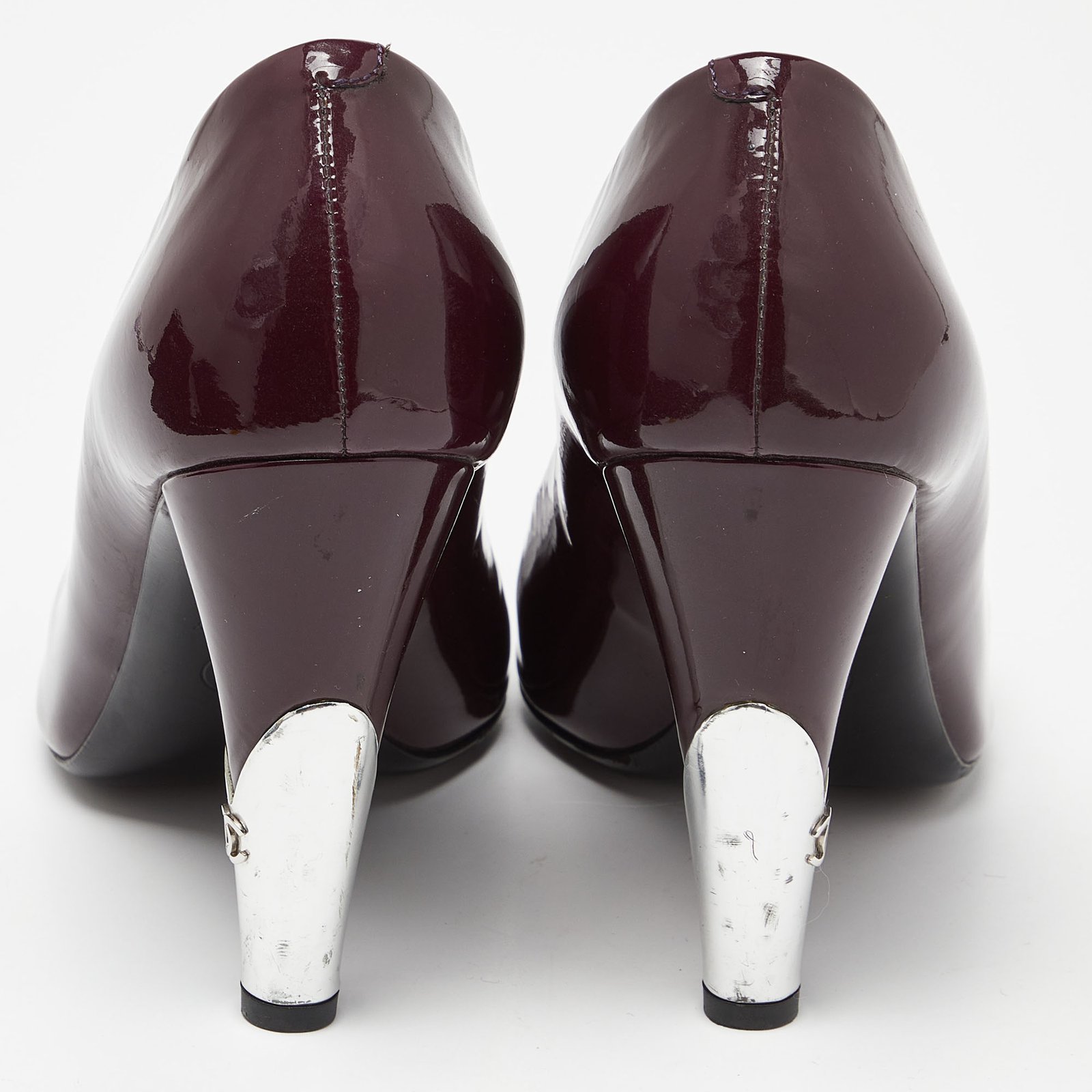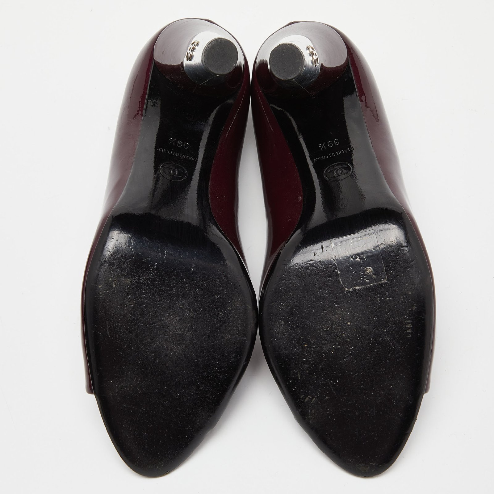 Chanel Purple/Silver Patent Leather Peep Toe CC Heel Pumps Size 39.5