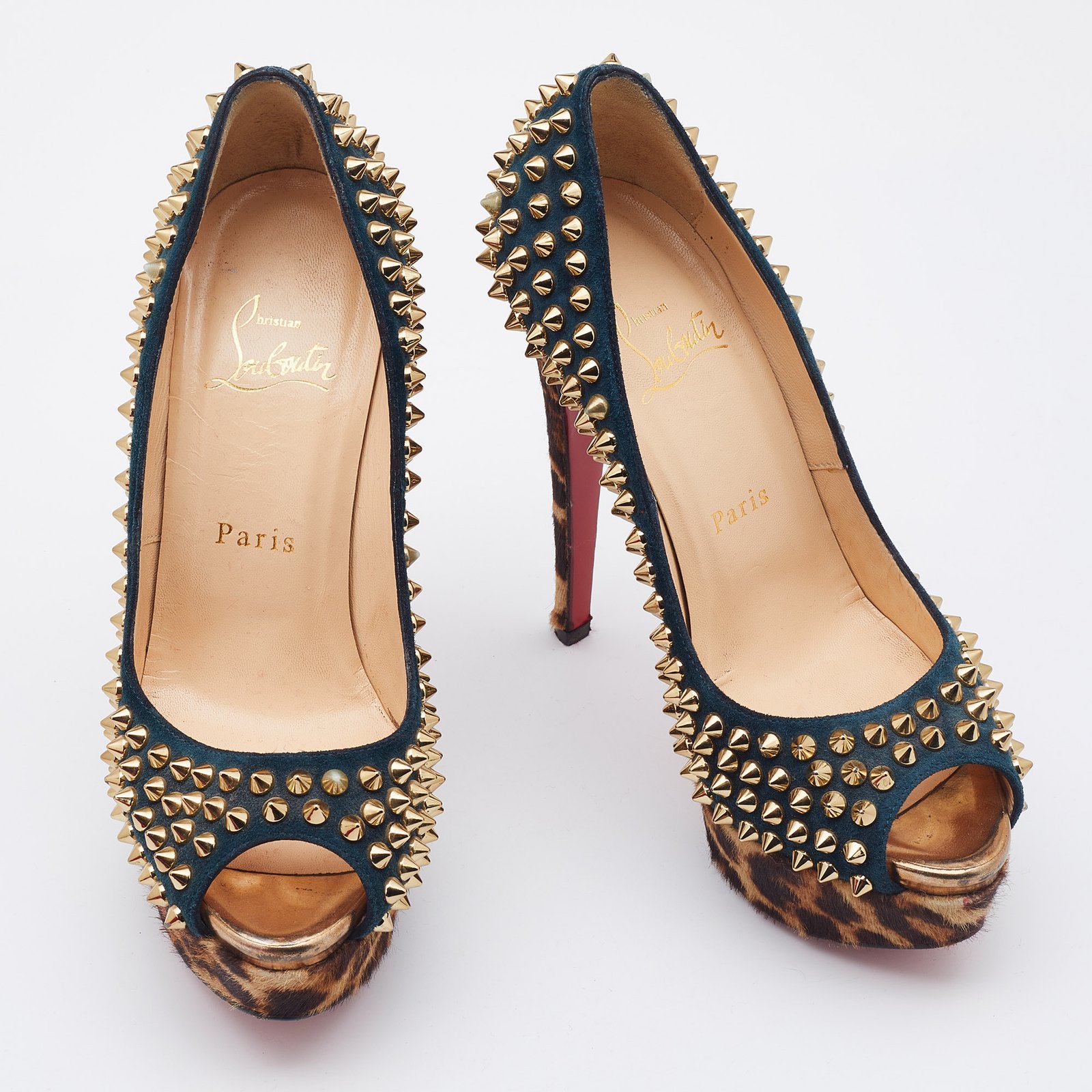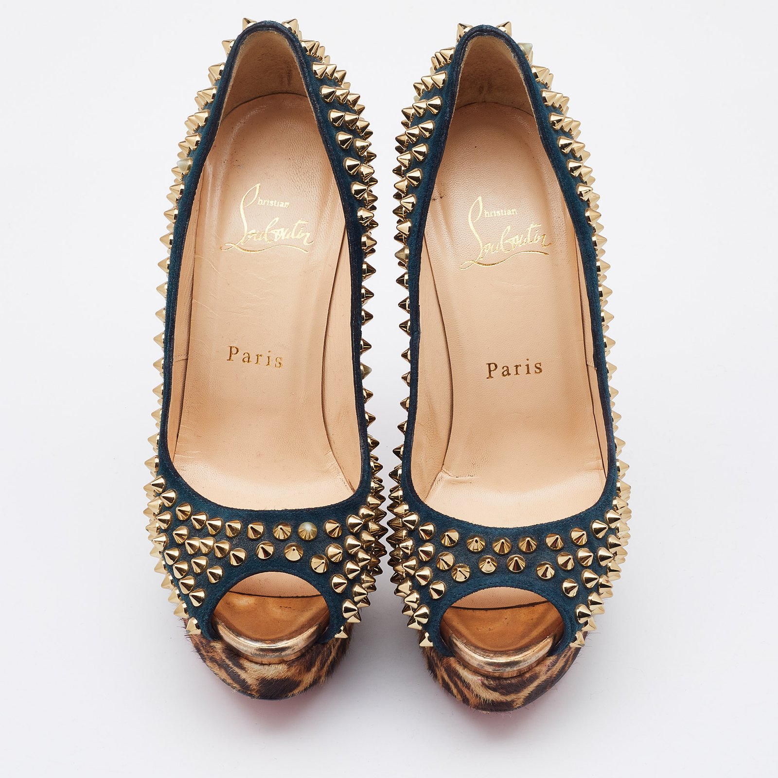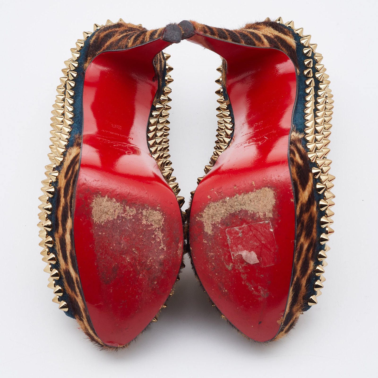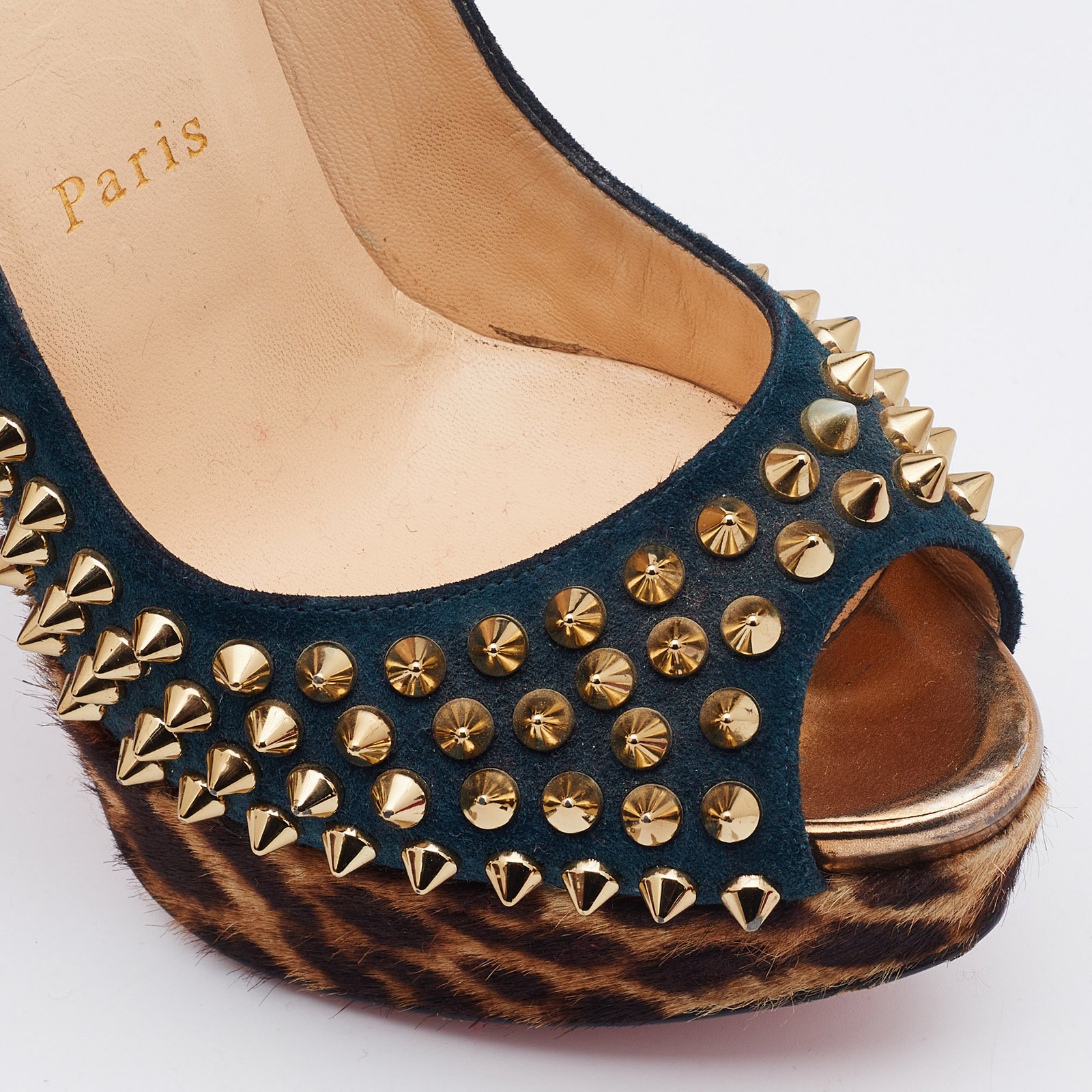 Christian Louboutin Multicolor Suede and Calfhair Lady Peep-Toe Spikes Platform Pumps Size 36