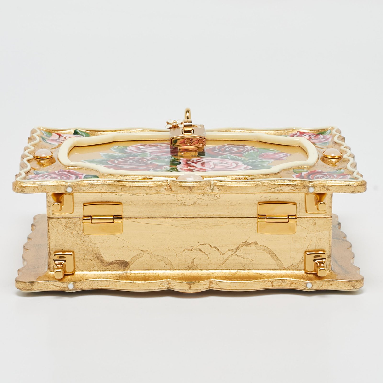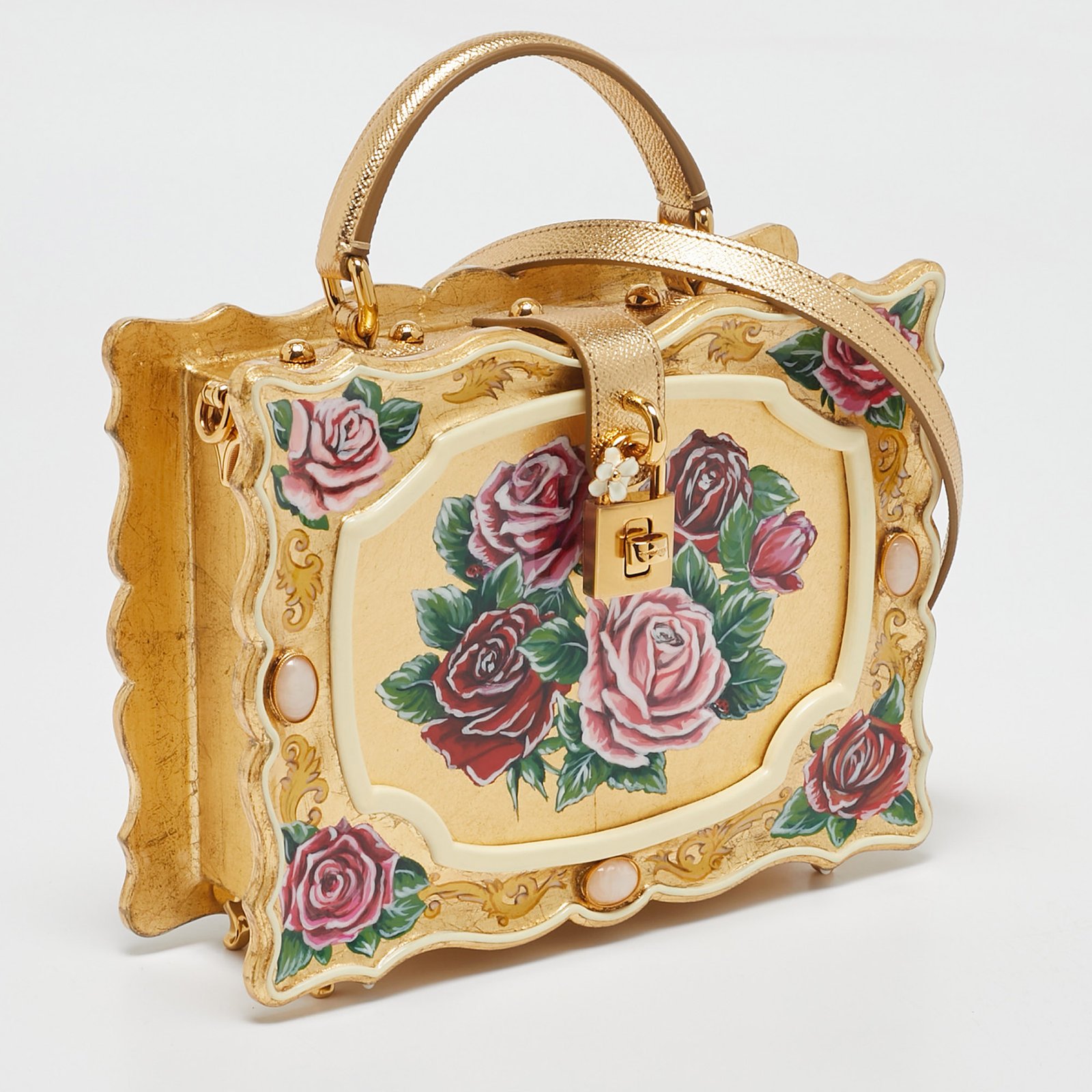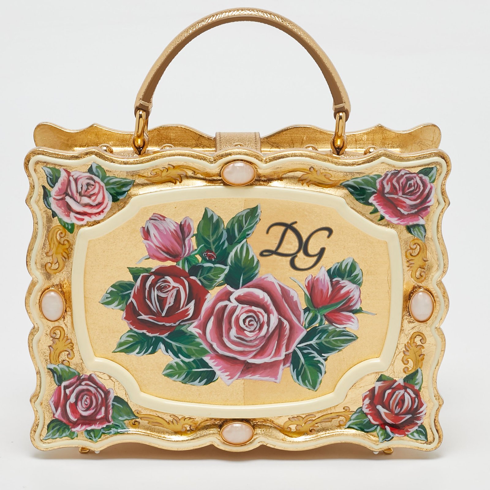 Dolce & Gabbana Gold/Red Rose Painted Wood Dolce Box Top Handle Bag