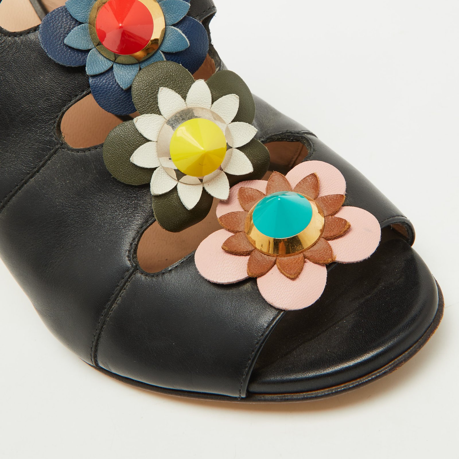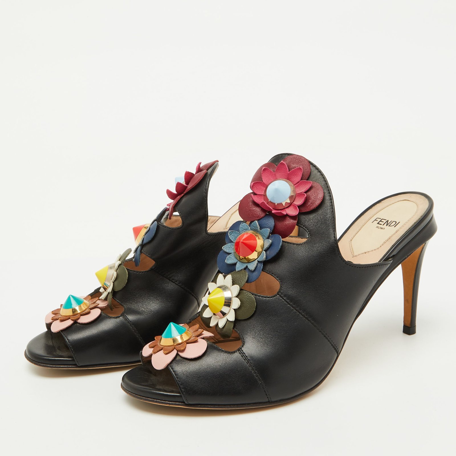 Fendi Black Leather Floral Applique Mules Size 37.5