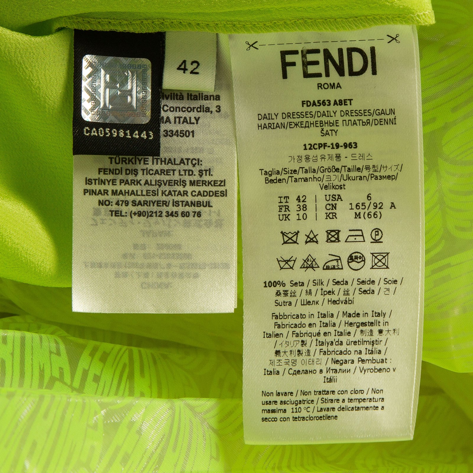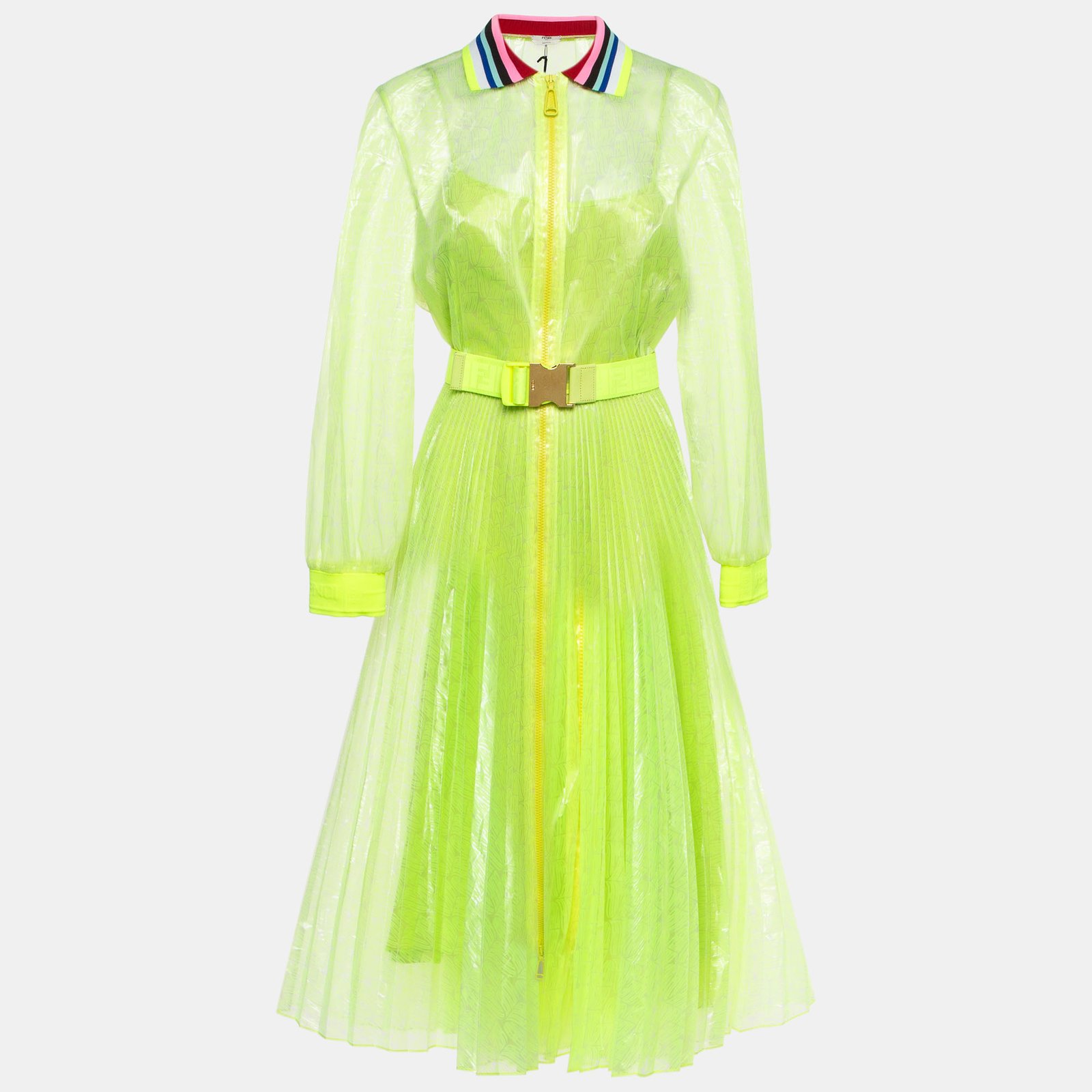 Fendi Neon Yellow Printed Synthetic Pleated Bleated Midi Dress M