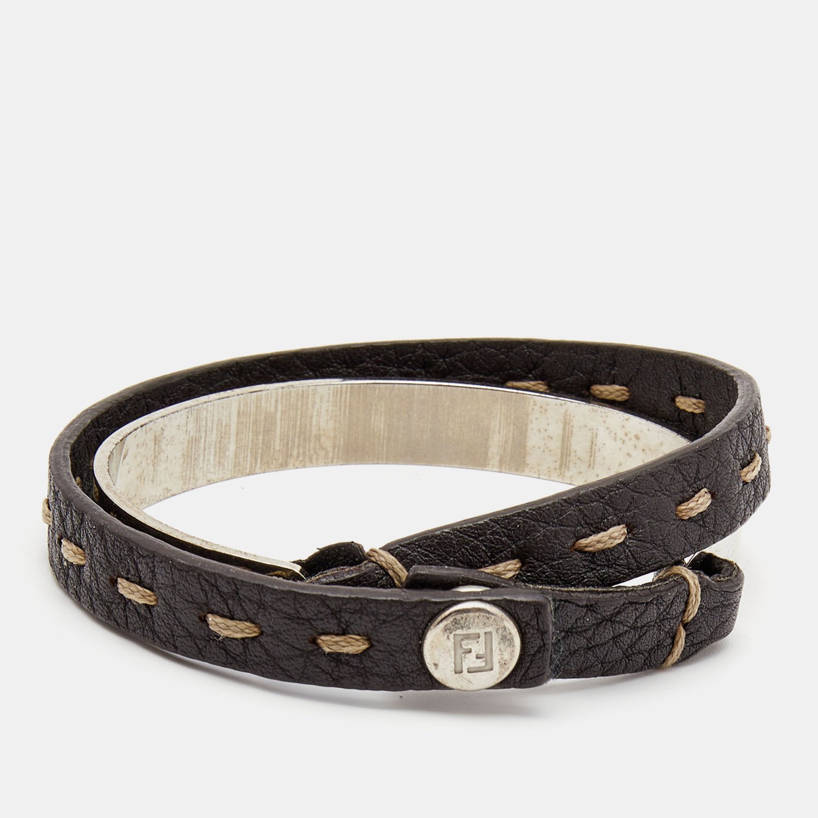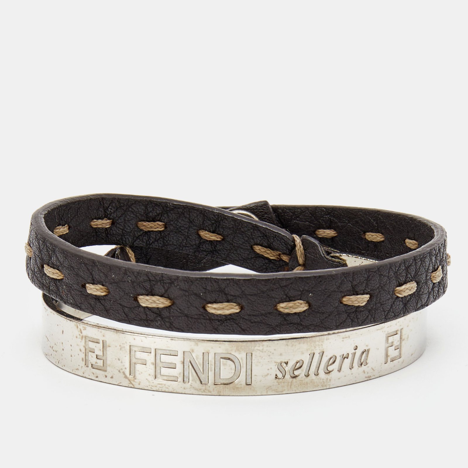 Fendi Selleria Silver Tone Cuff & Metallic Leather Double Wrap Bracelet