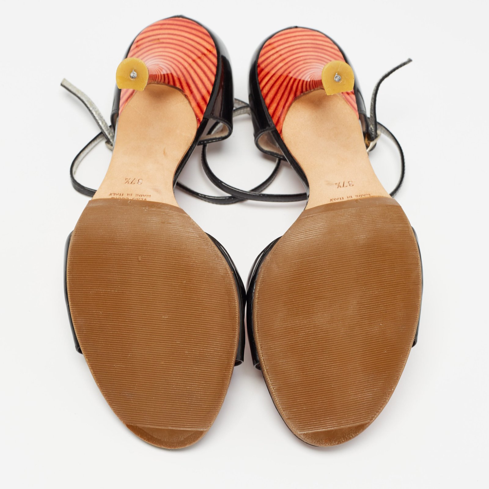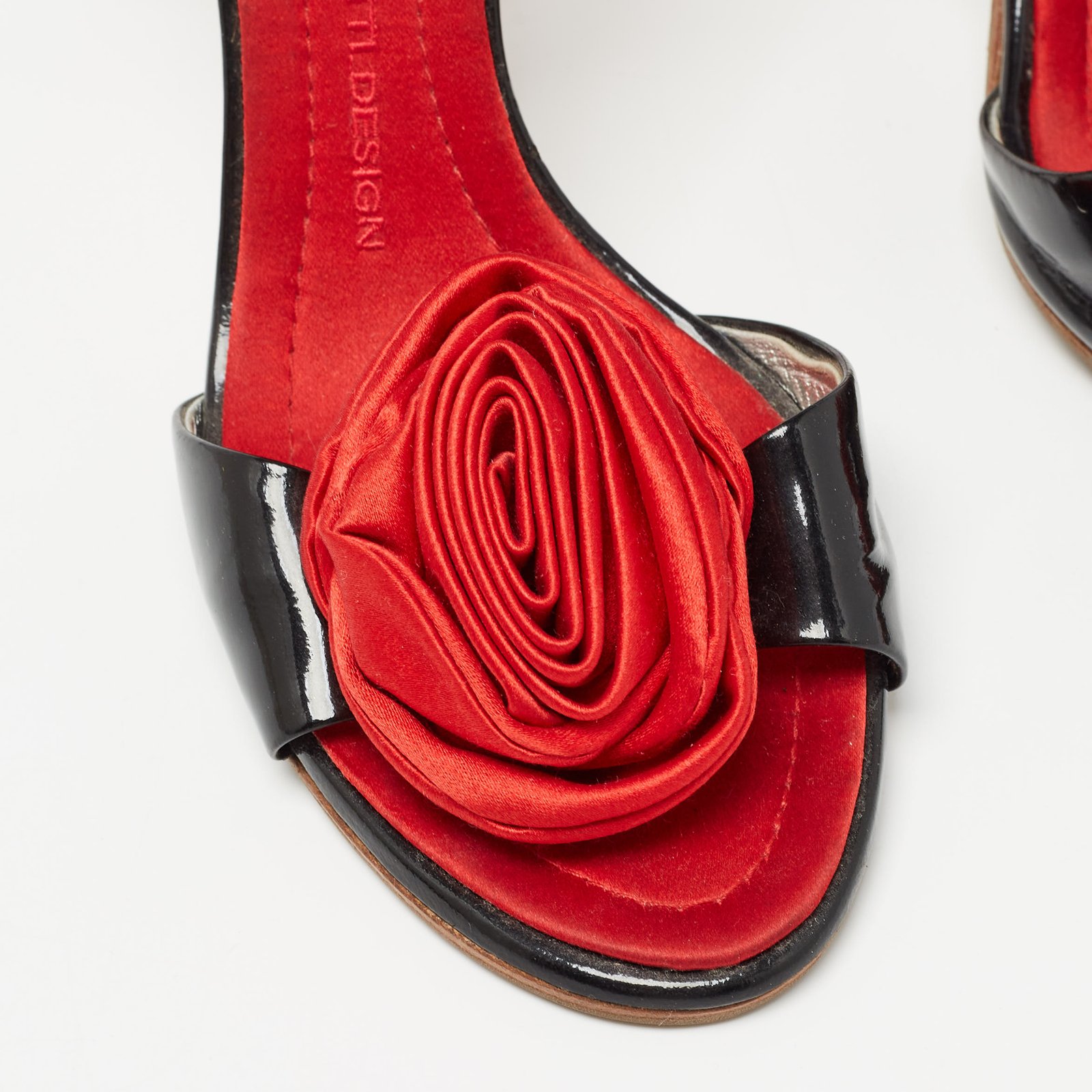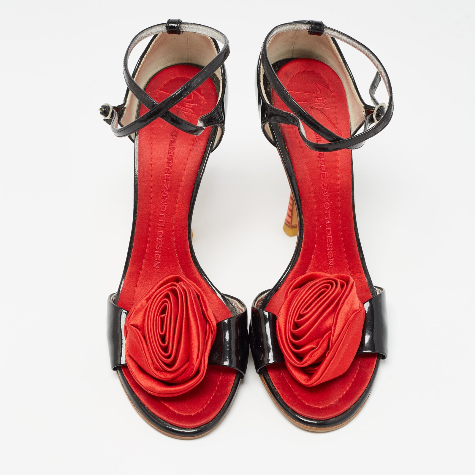 Giuseppe Zanotti Black/Red Patent Leather and Satin Rose Applique Sandals Size 37.5