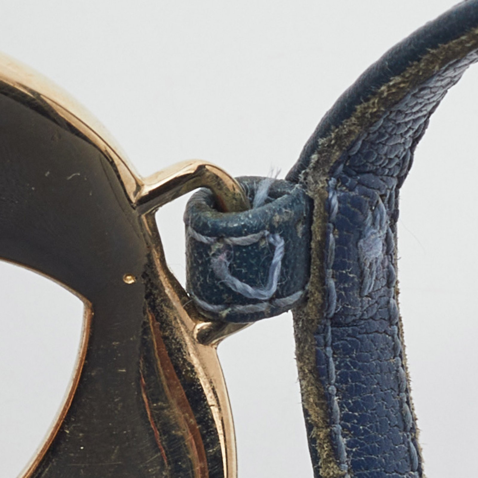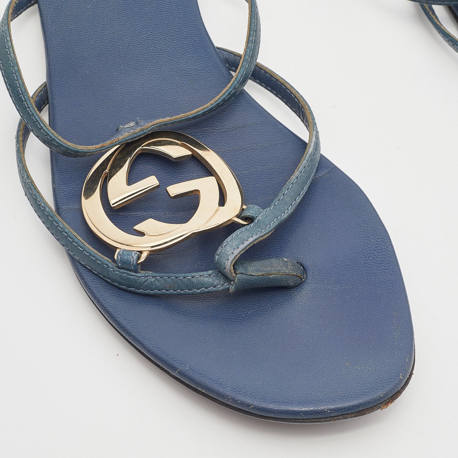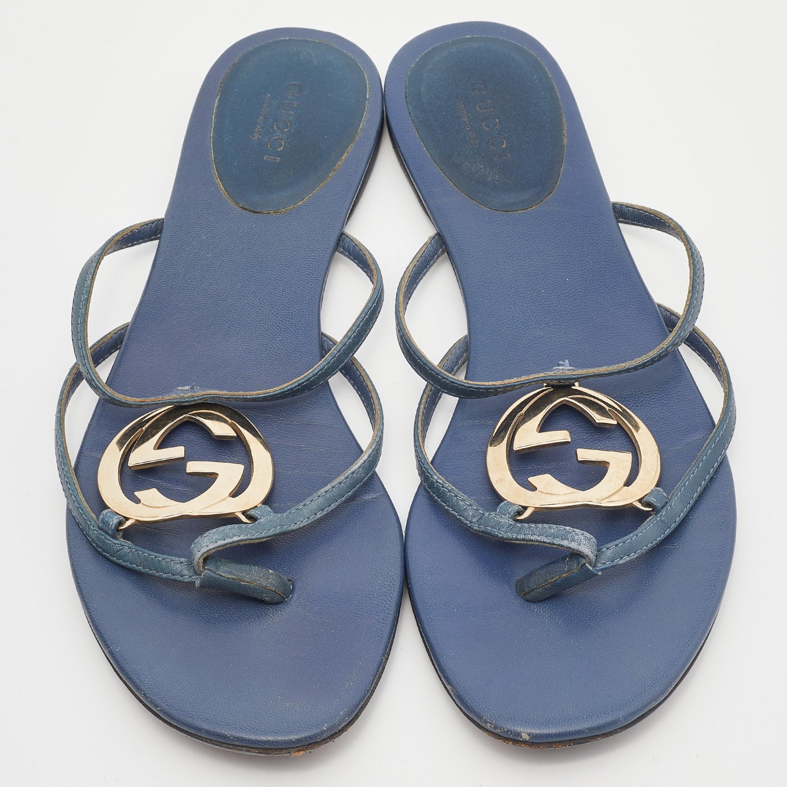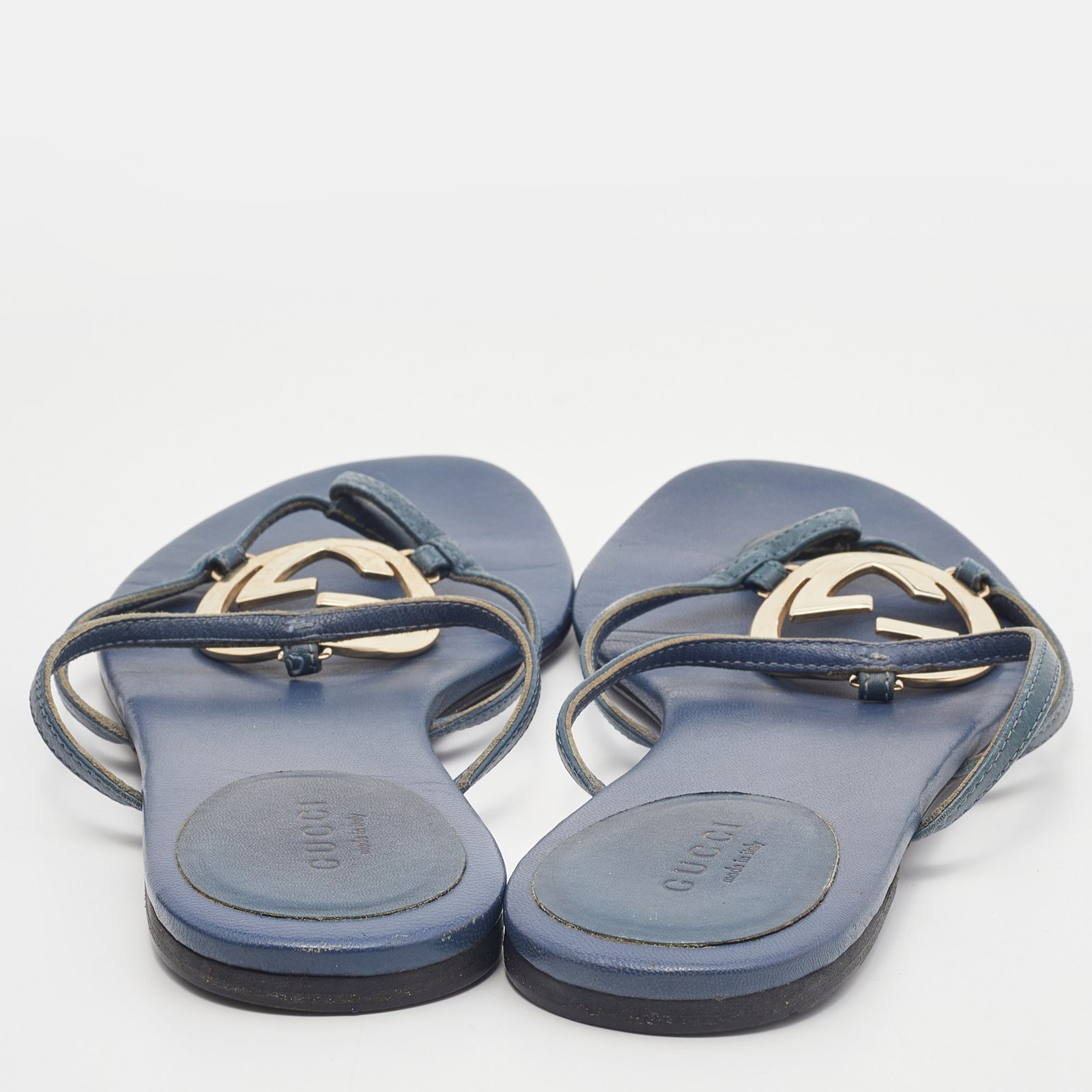 Gucci Blue Leather GG Cage Flat Thong Sandals Size 37