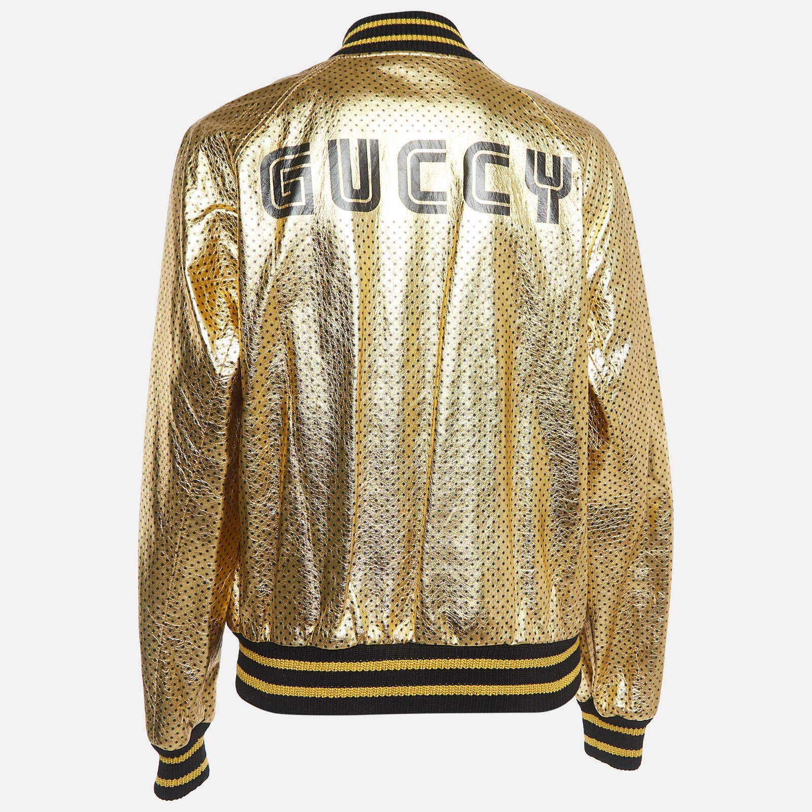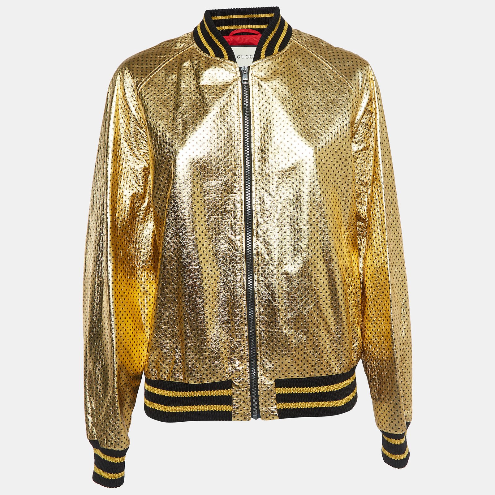 Gucci Gold Metallic Stars Print Crinkle Leather Bomber Jacket XS