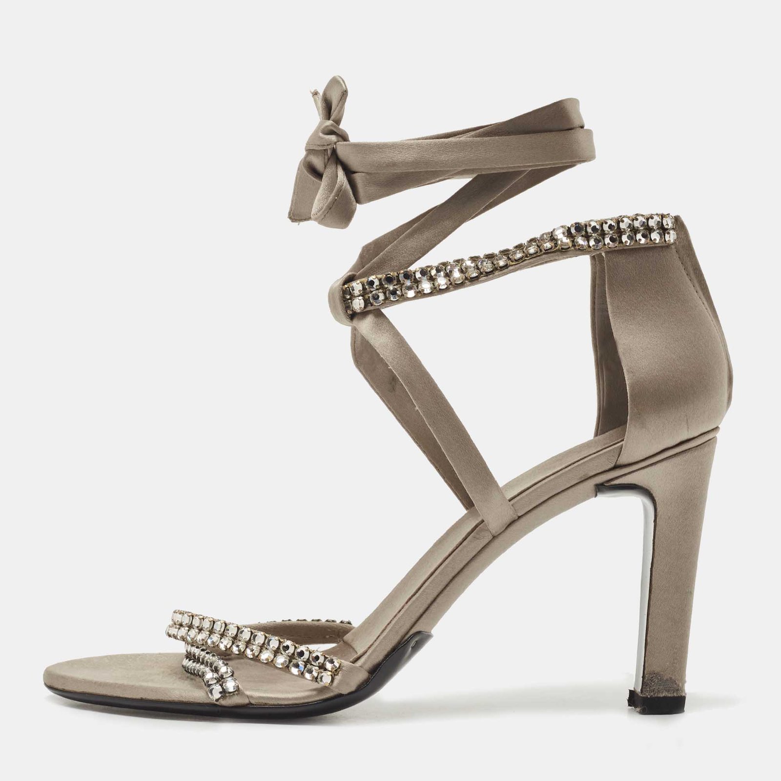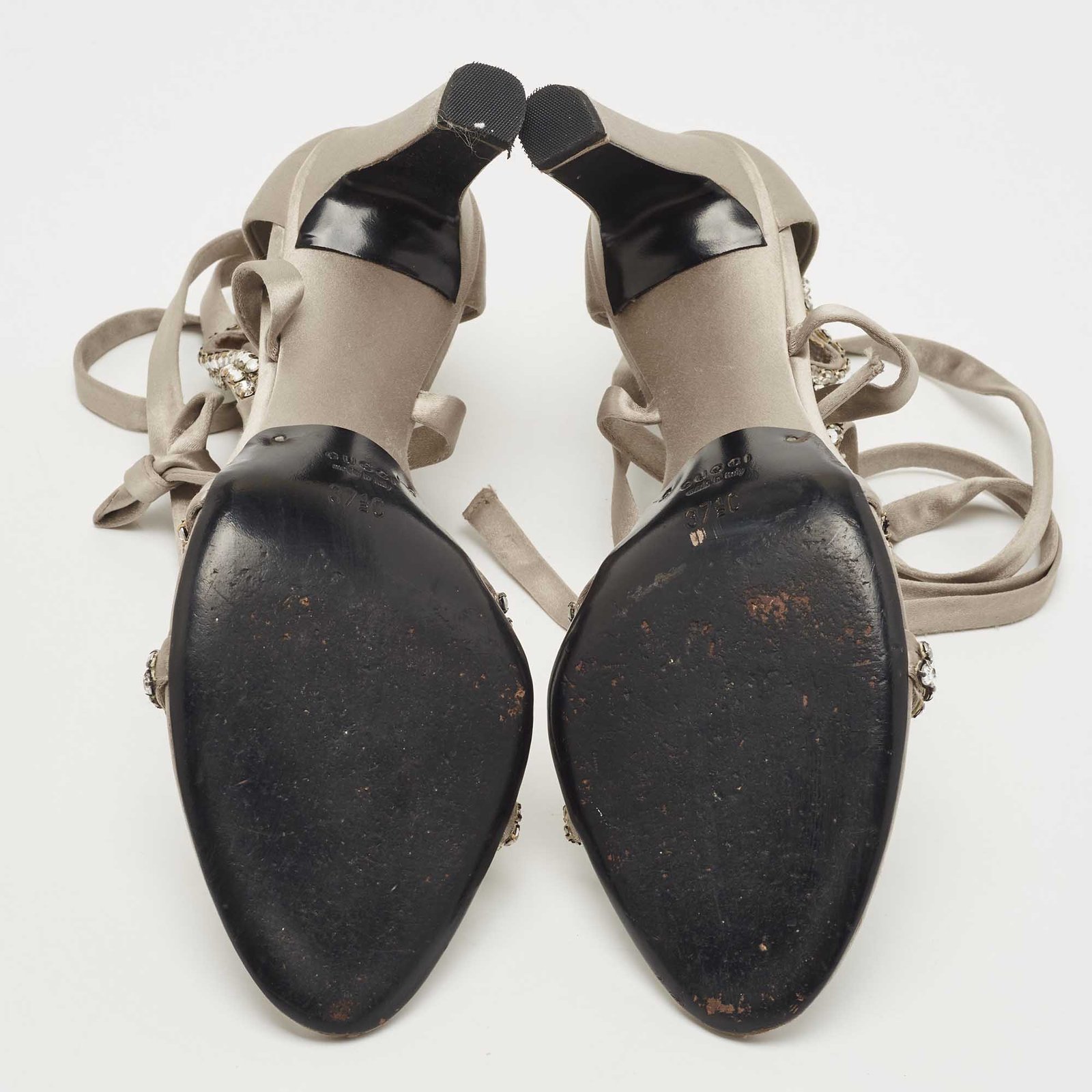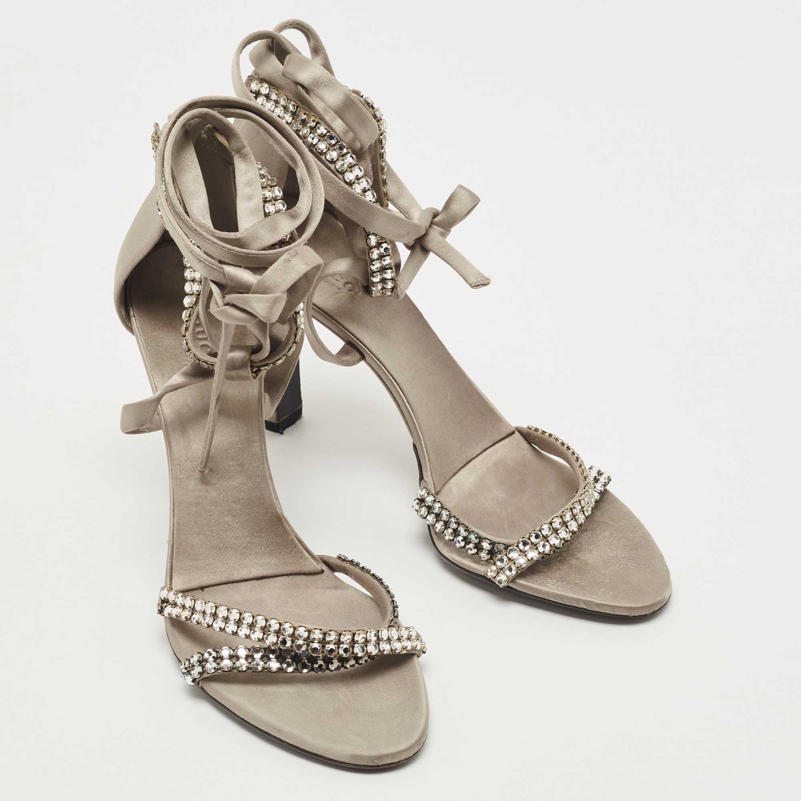 Gucci Grey Satin Crystal Embellished Ankle Wrap Sandals Size 37.5