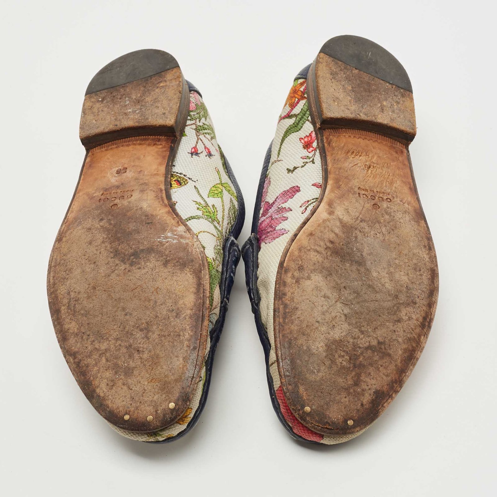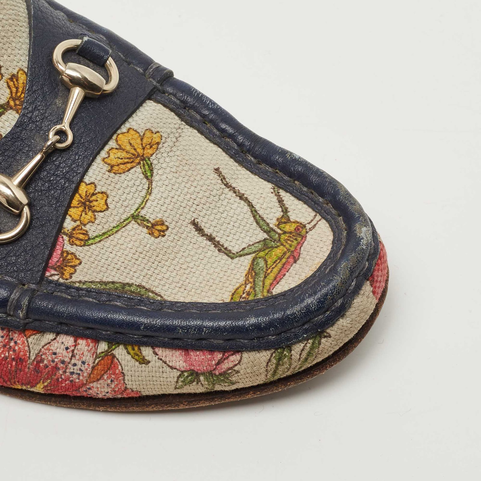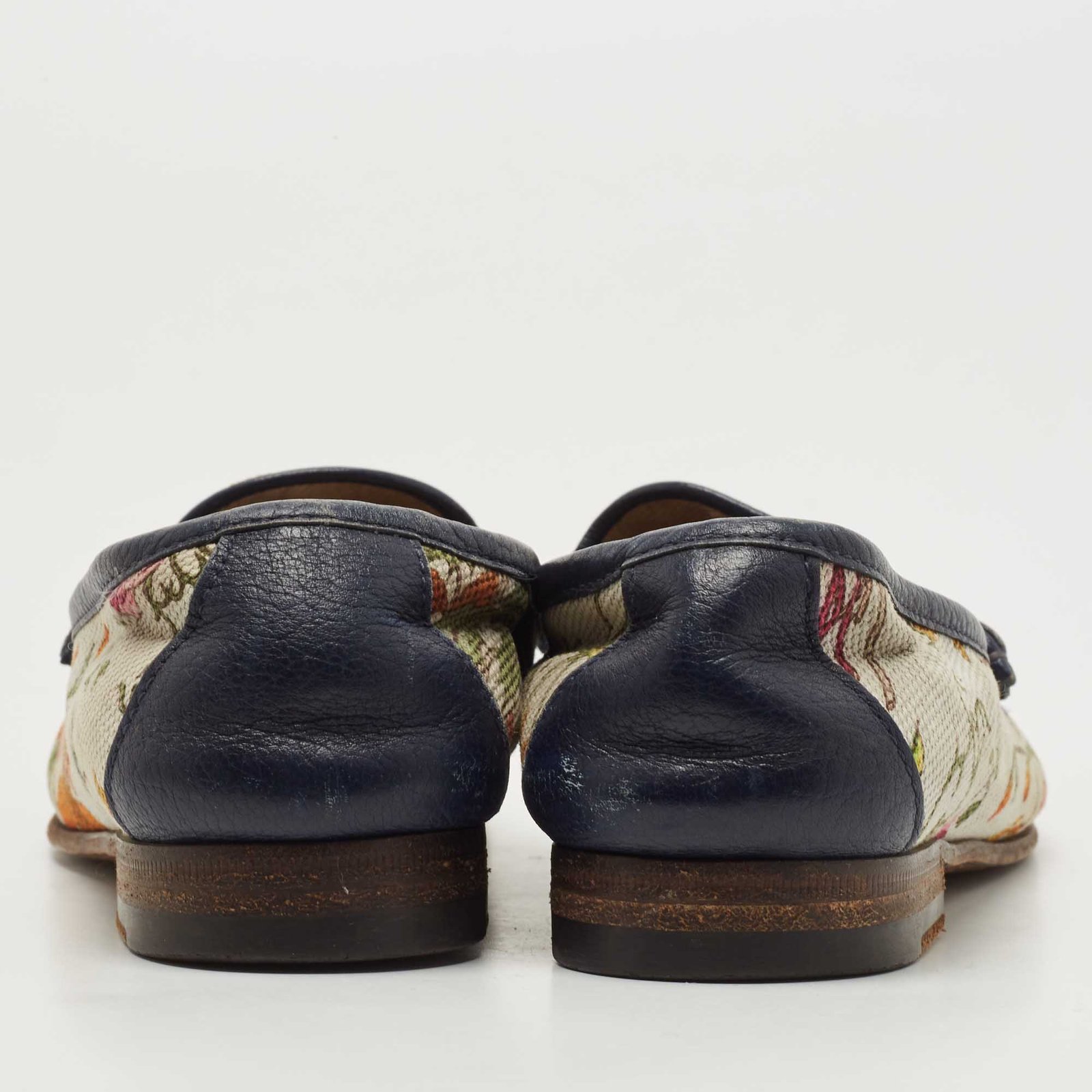 Gucci Navy Blue/White Leather and Floral Print Canvas 1953 Horsebit Loafers Size 36