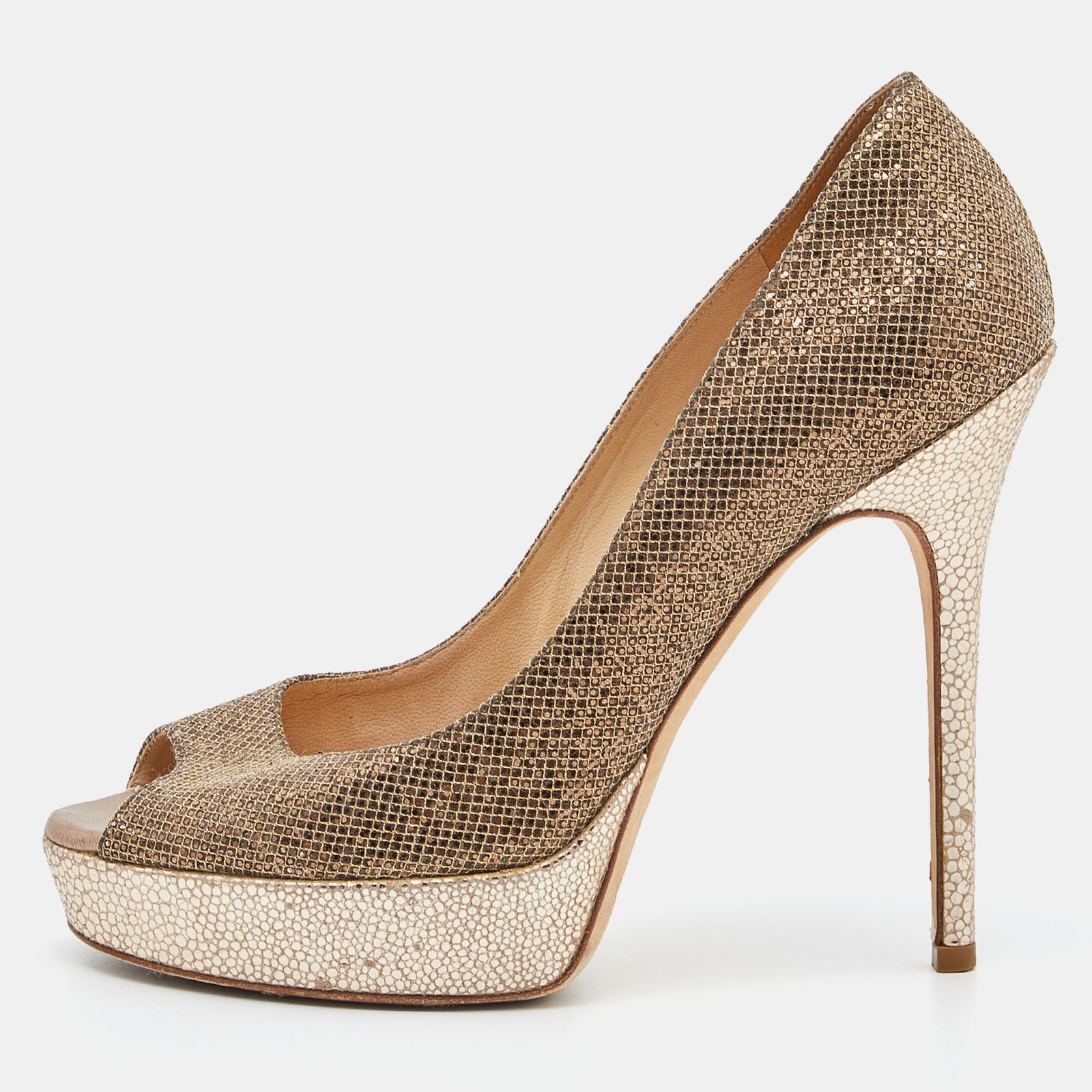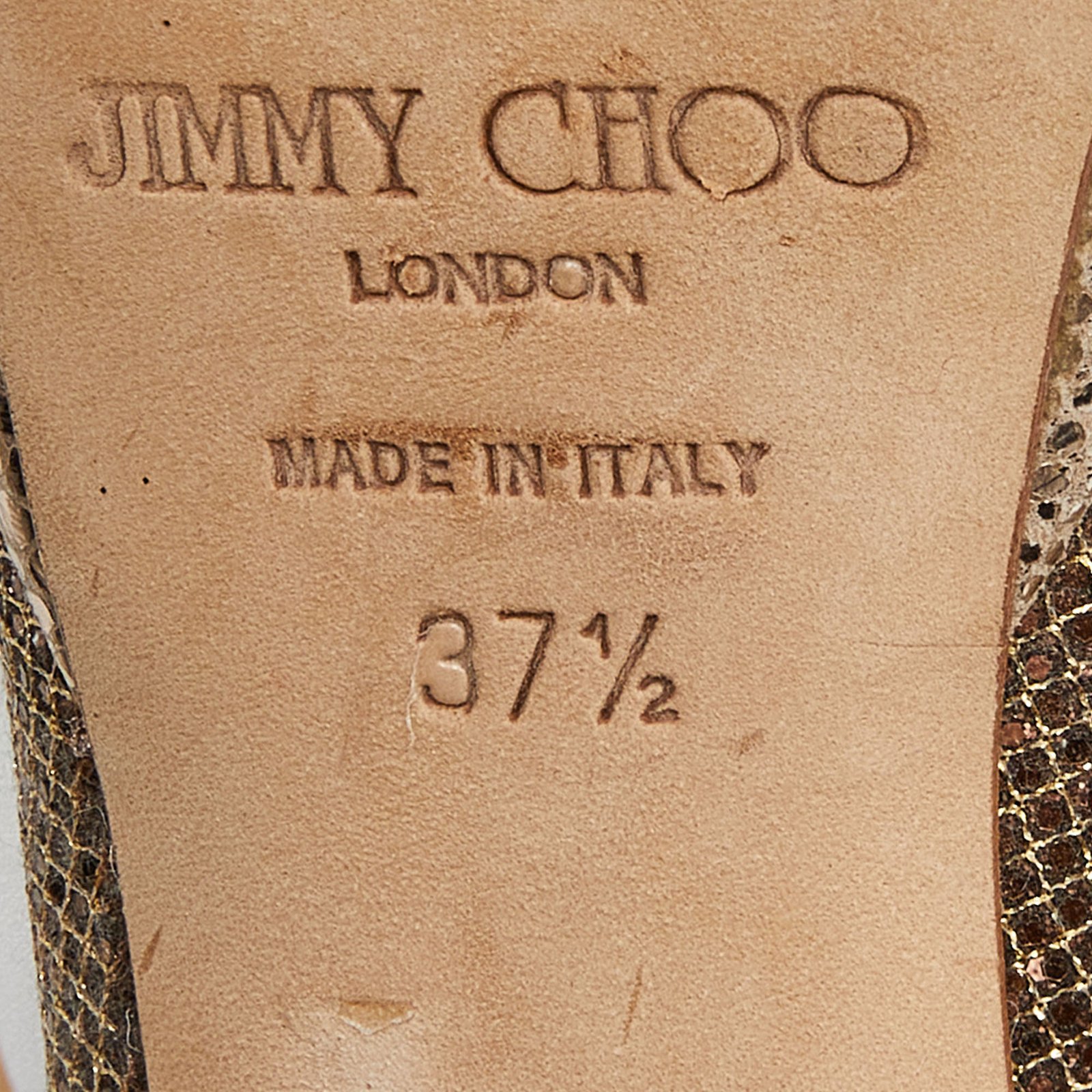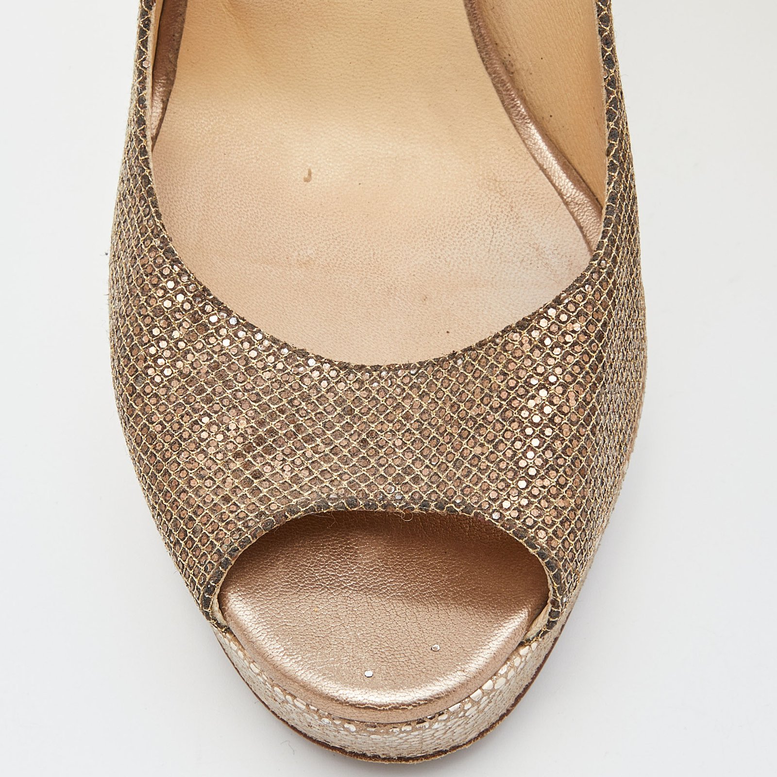 Jimmy Choo Gold Glitter Lamè Fabric Dahlia Platform Peep Toe Pumps Size 37.5