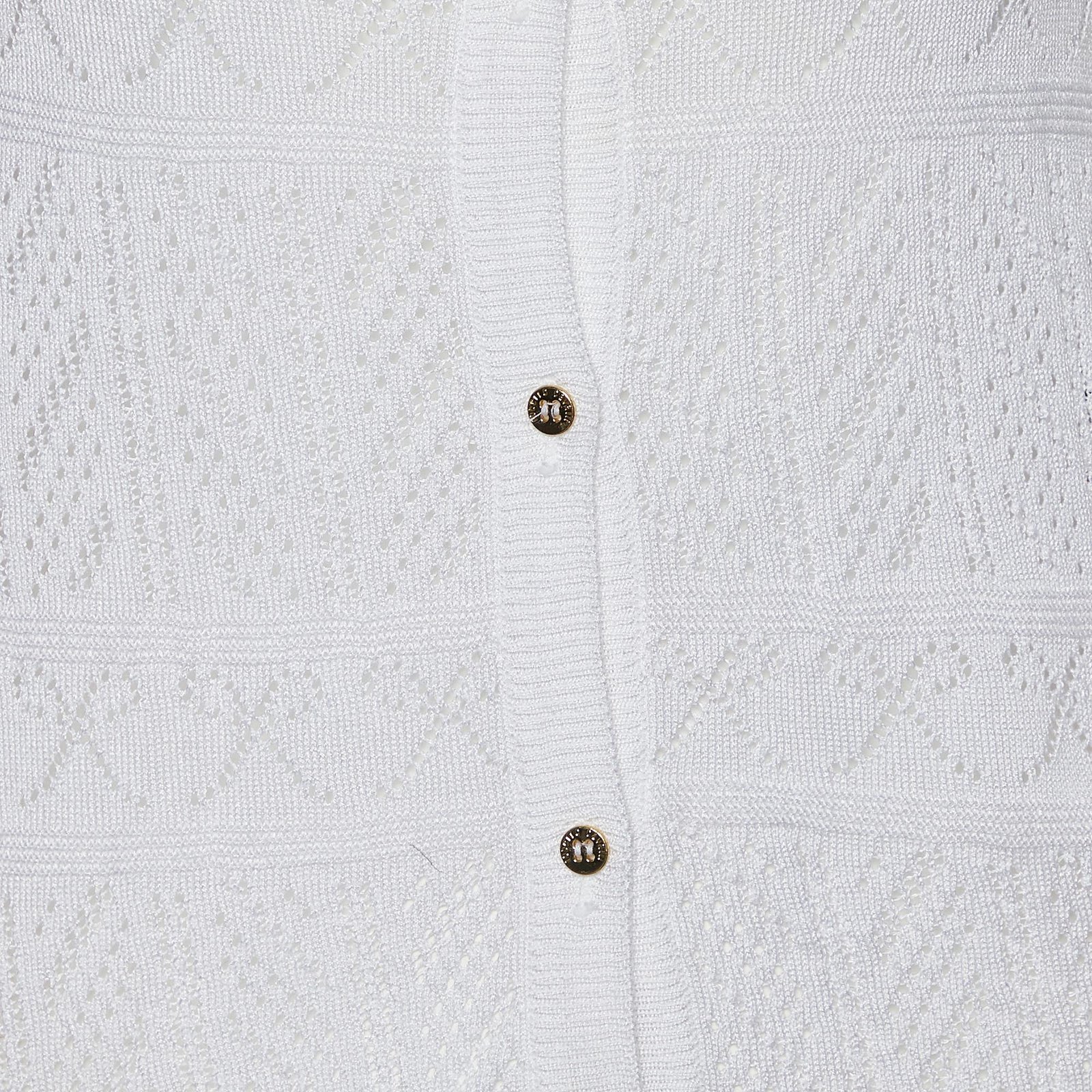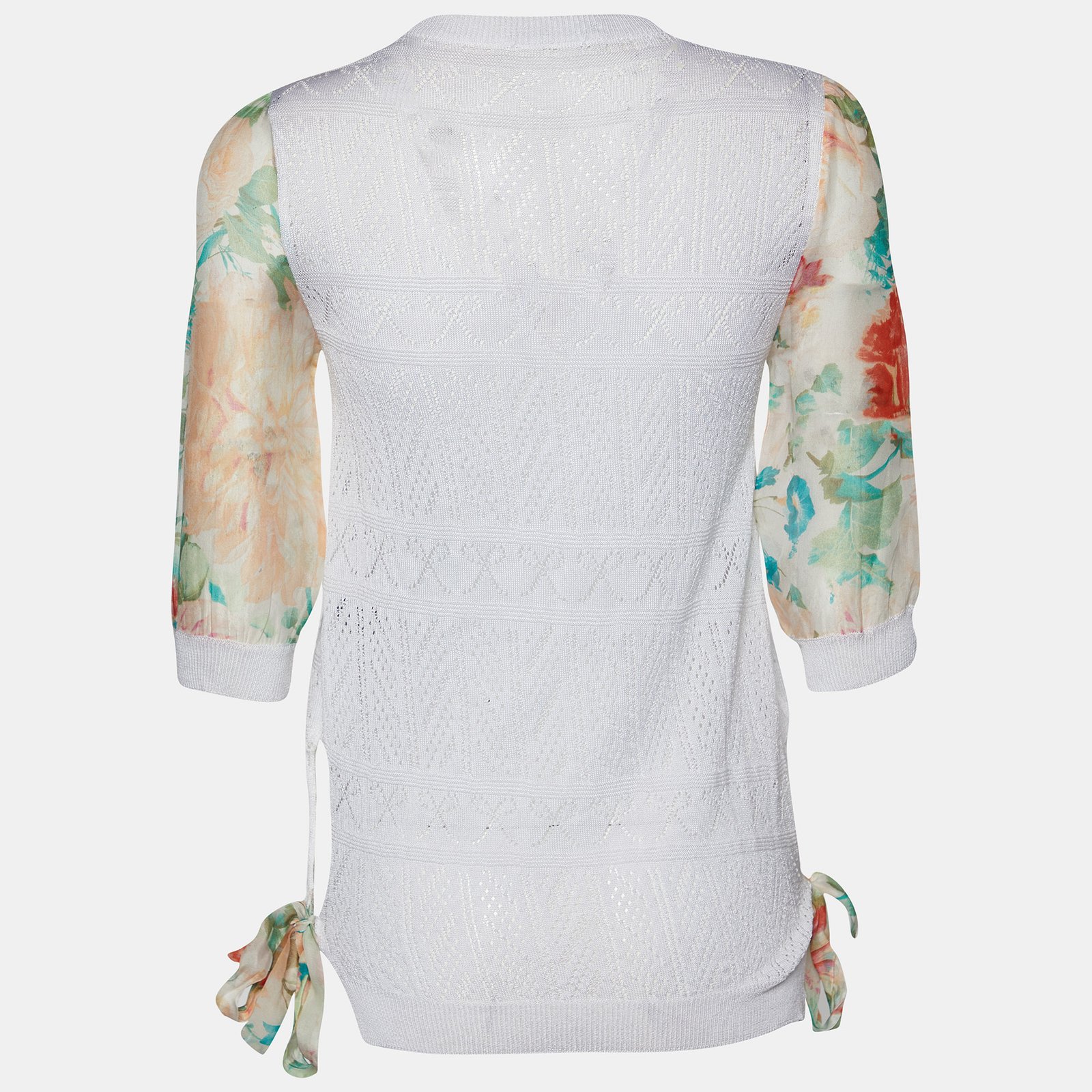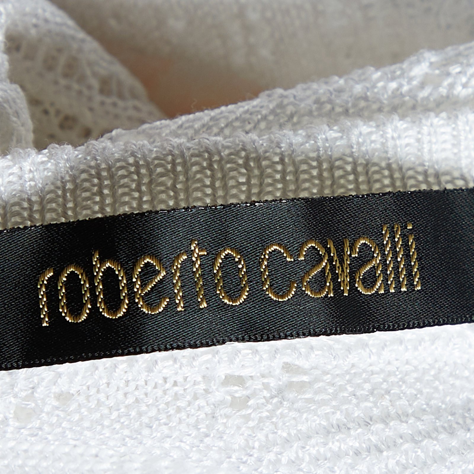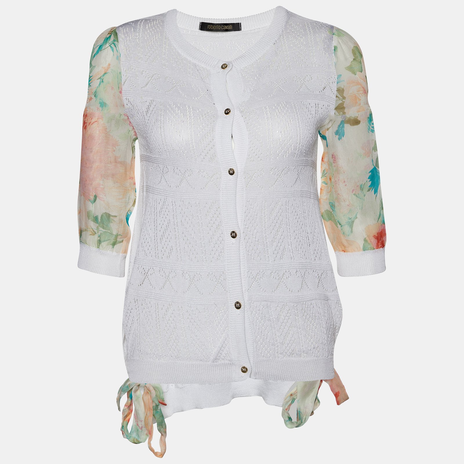 Roberto Cavalli White Perforated Knit & Printed Silk Sleeve Cardigan S