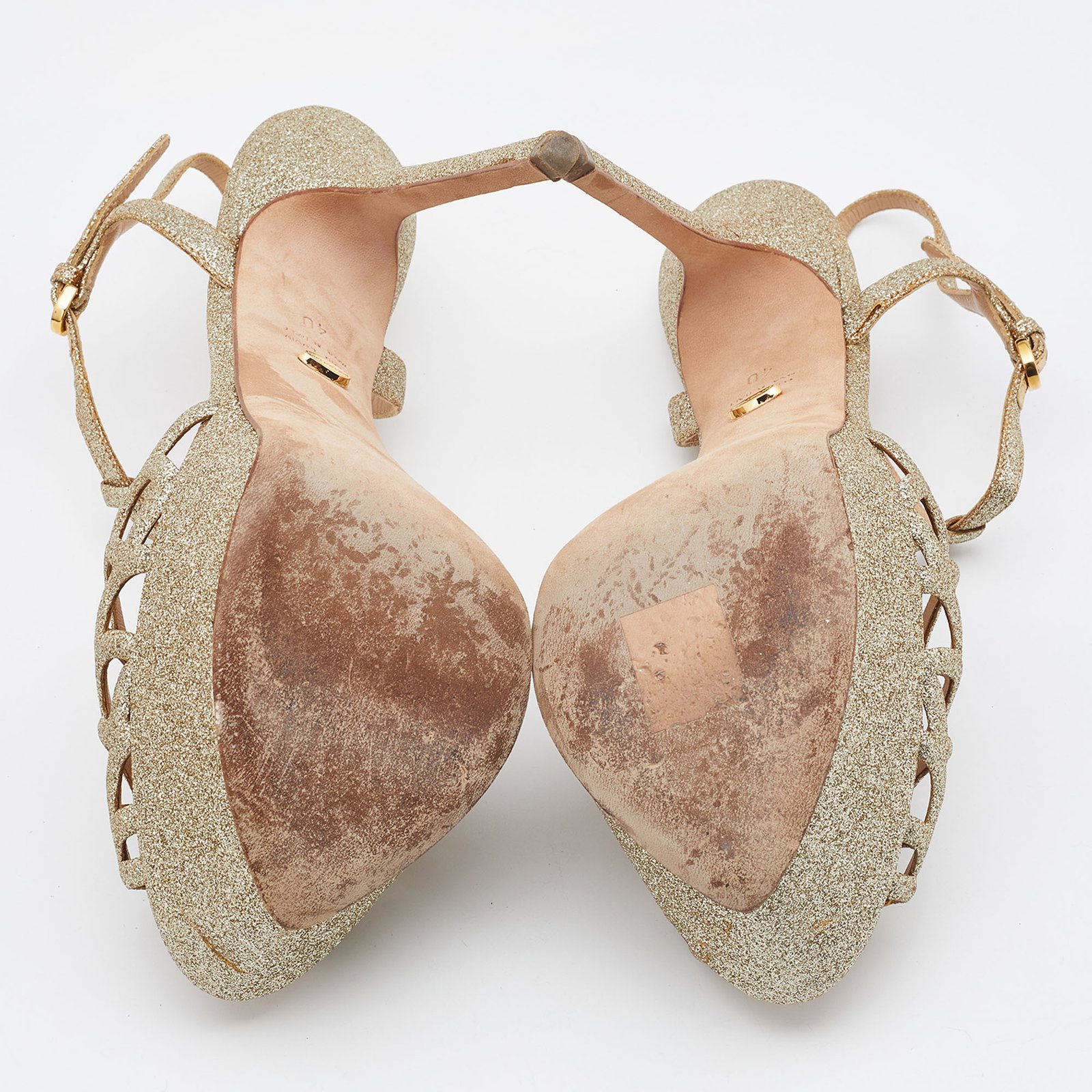 Sergio Rossi Gold Glitter Leather Laser Cut Out Platform Sandals Size 40 - Image 9