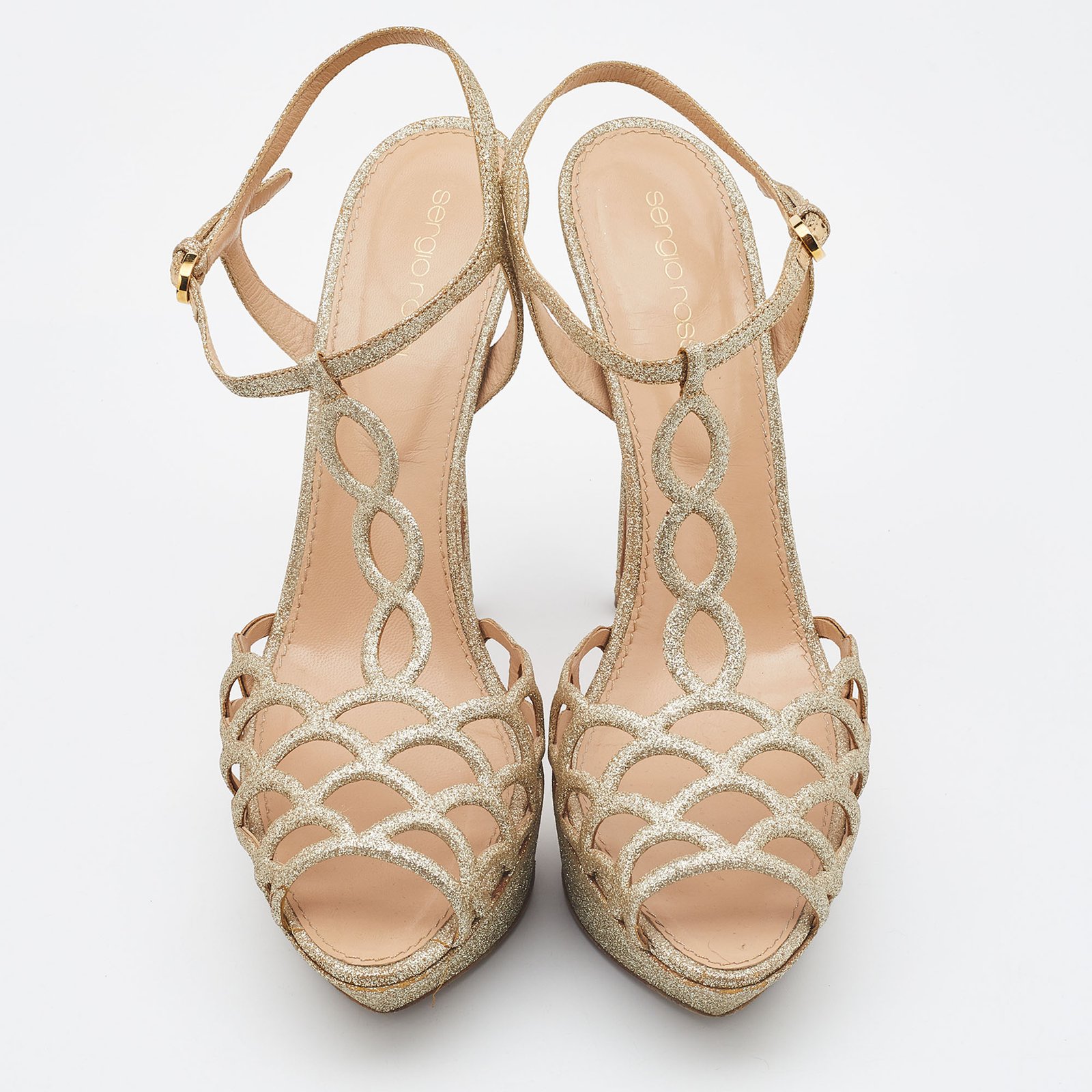Sergio Rossi Gold Glitter Leather Laser Cut Out Platform Sandals Size 40