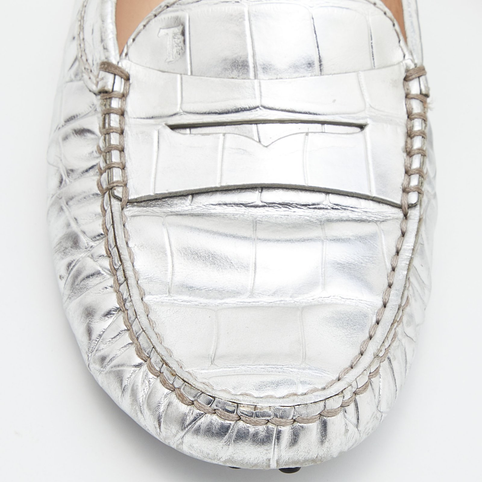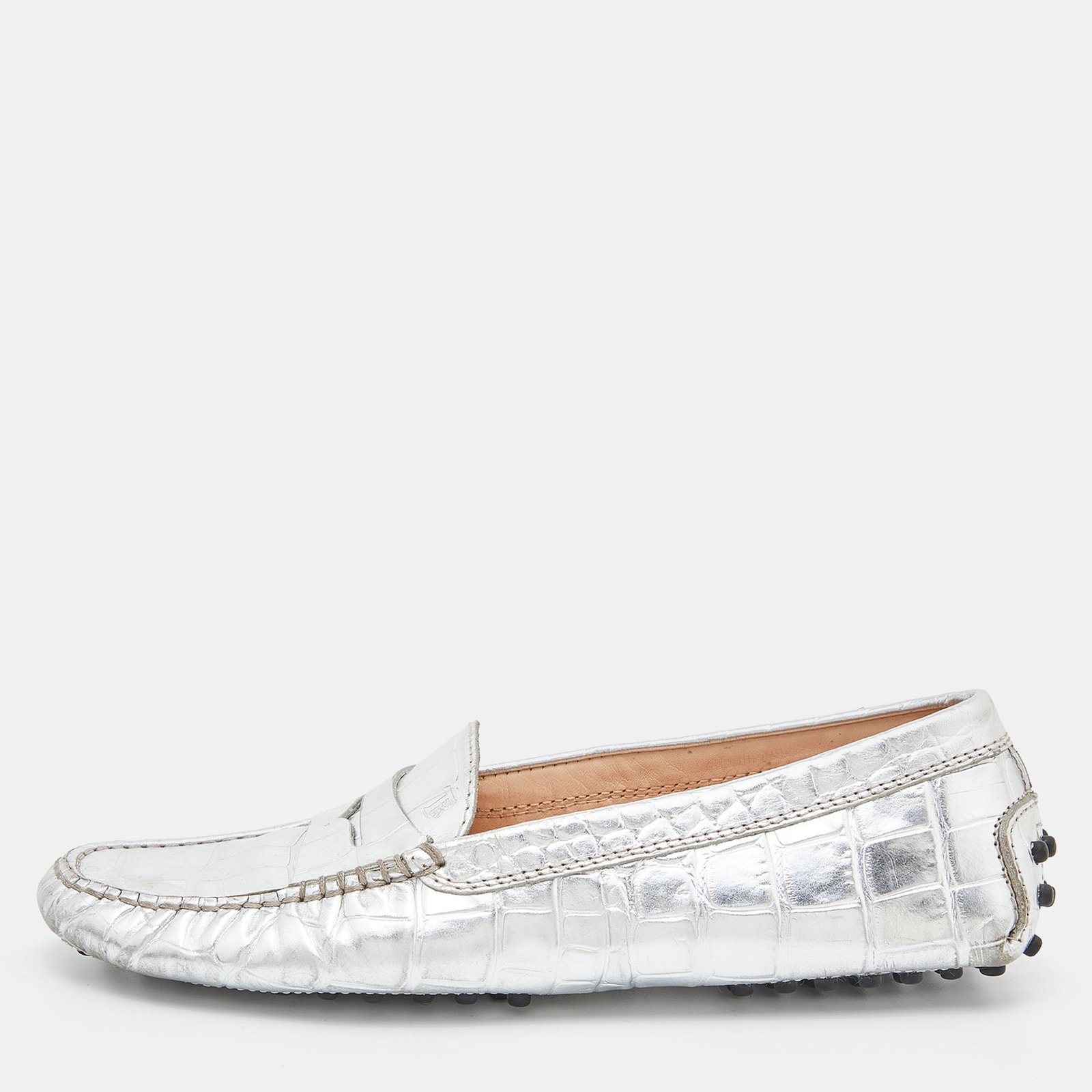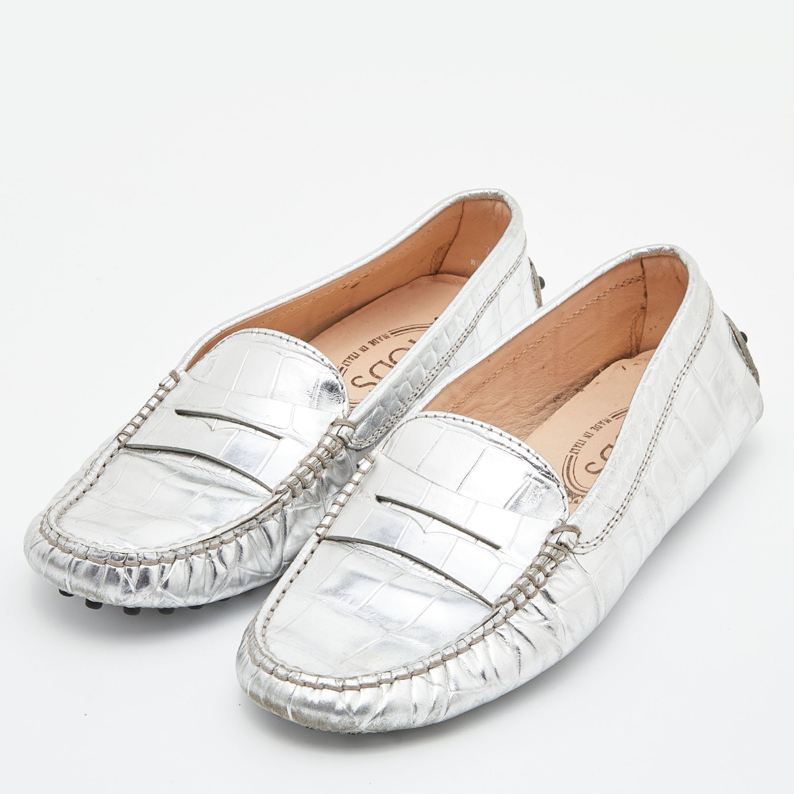 Tod’s Silver Croc Embossed Leather Loafers Size 35.5