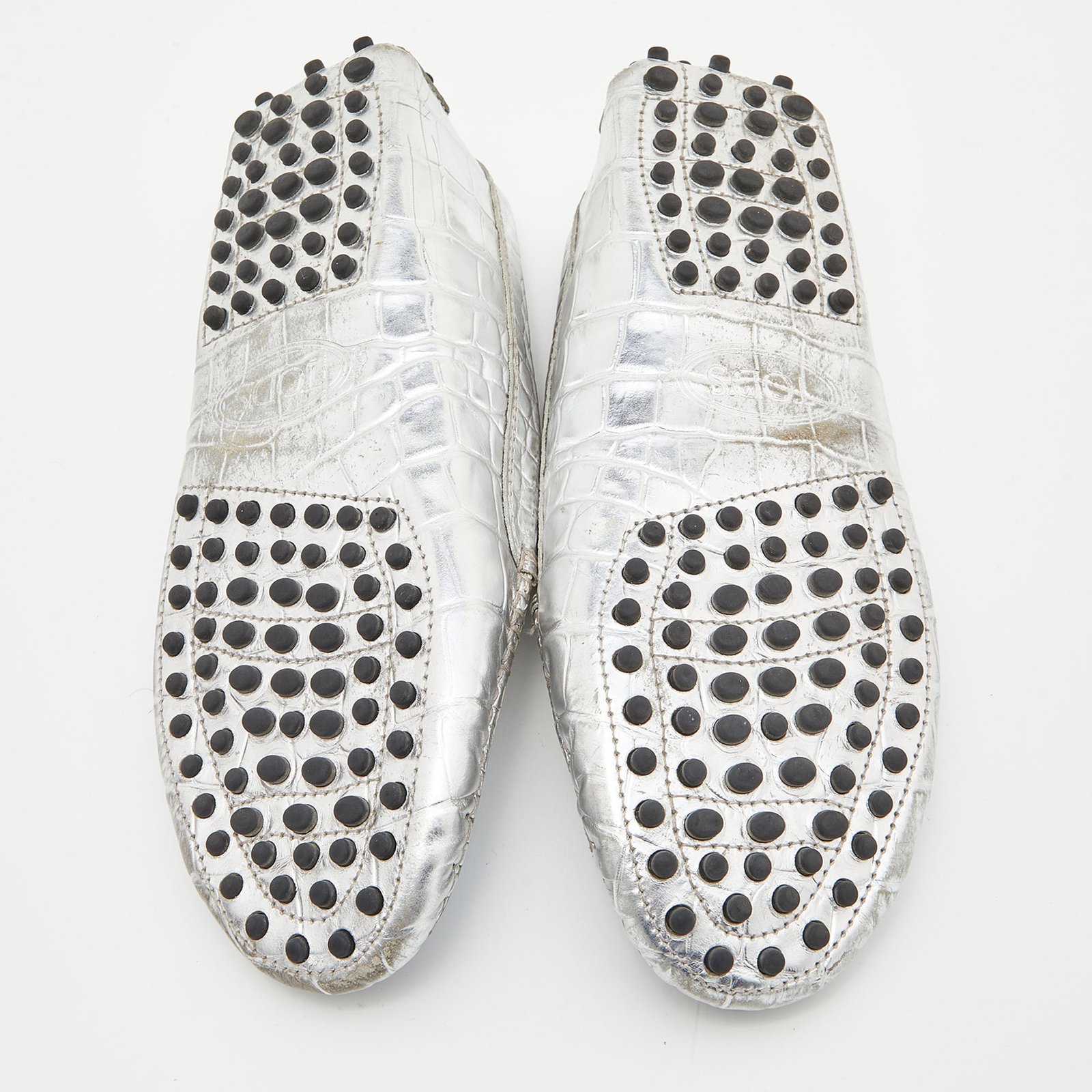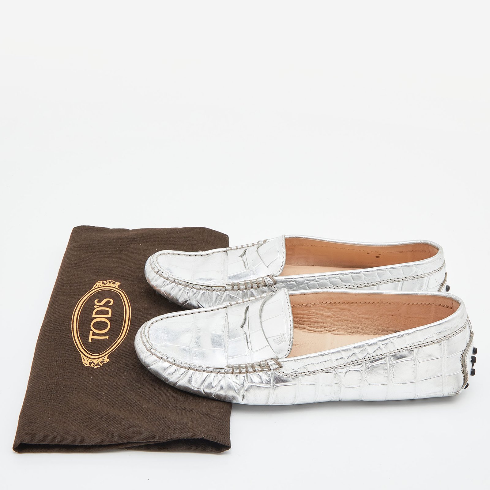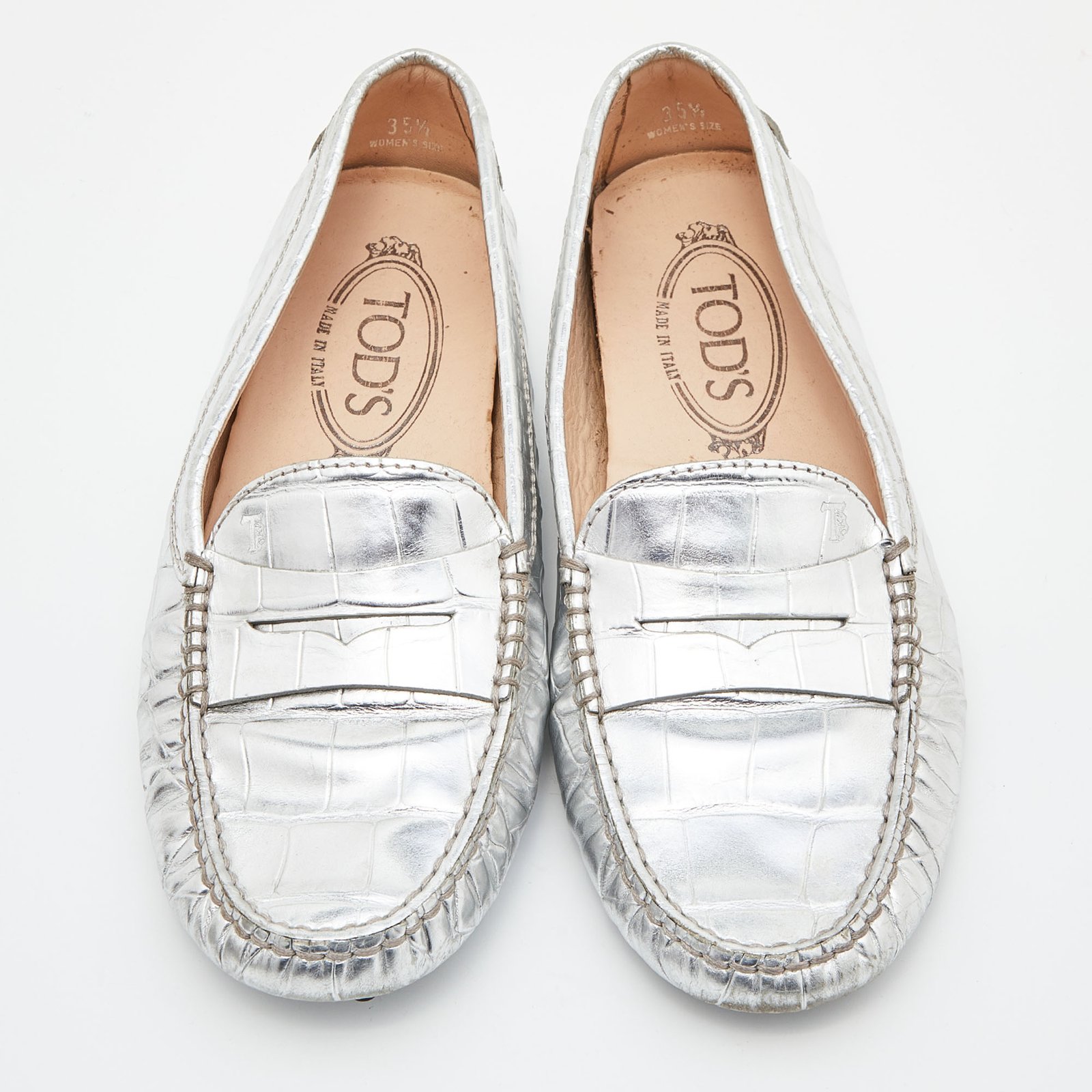 Tod’s Silver Croc Embossed Leather Loafers Size 35.5