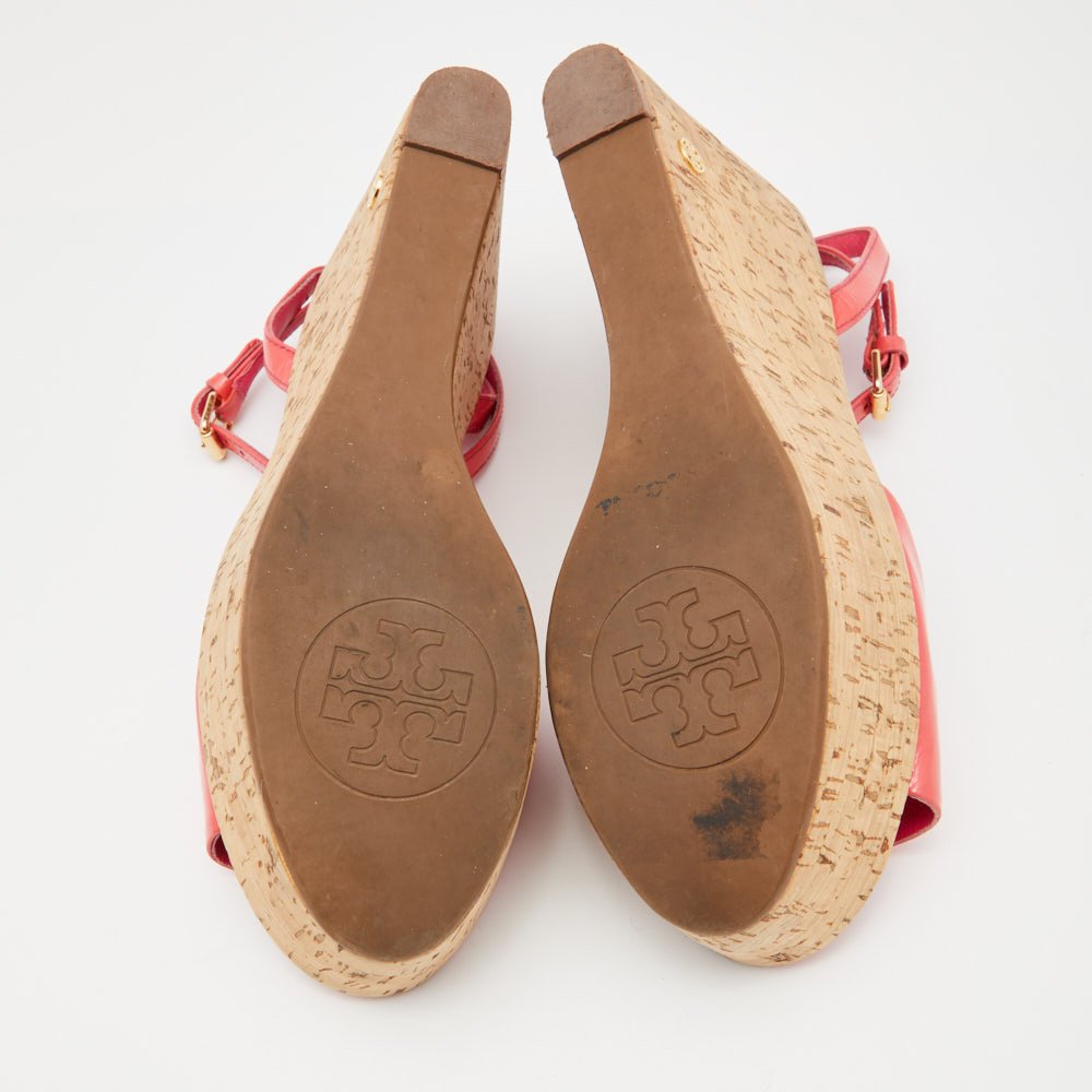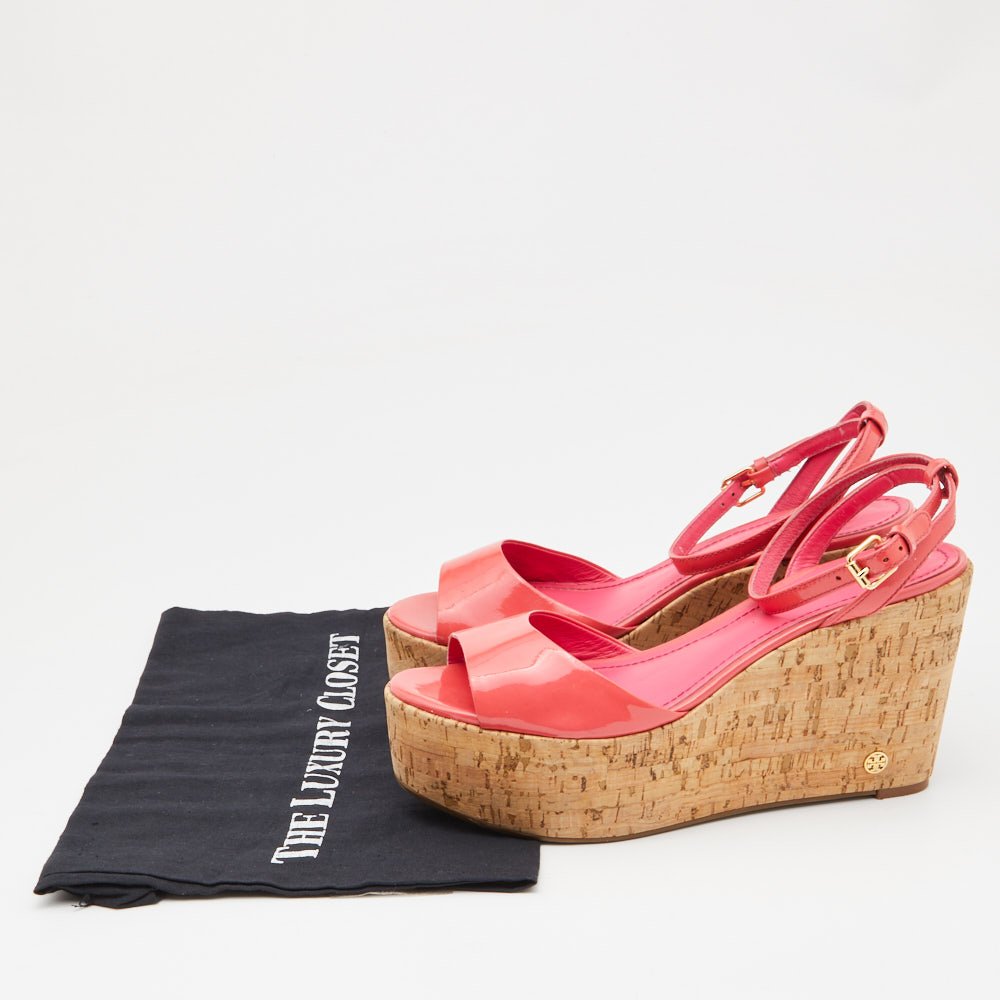 Tory Burch Pink Patent Leather Dahlia Cork Platform Wedge Sandals Size 38.5