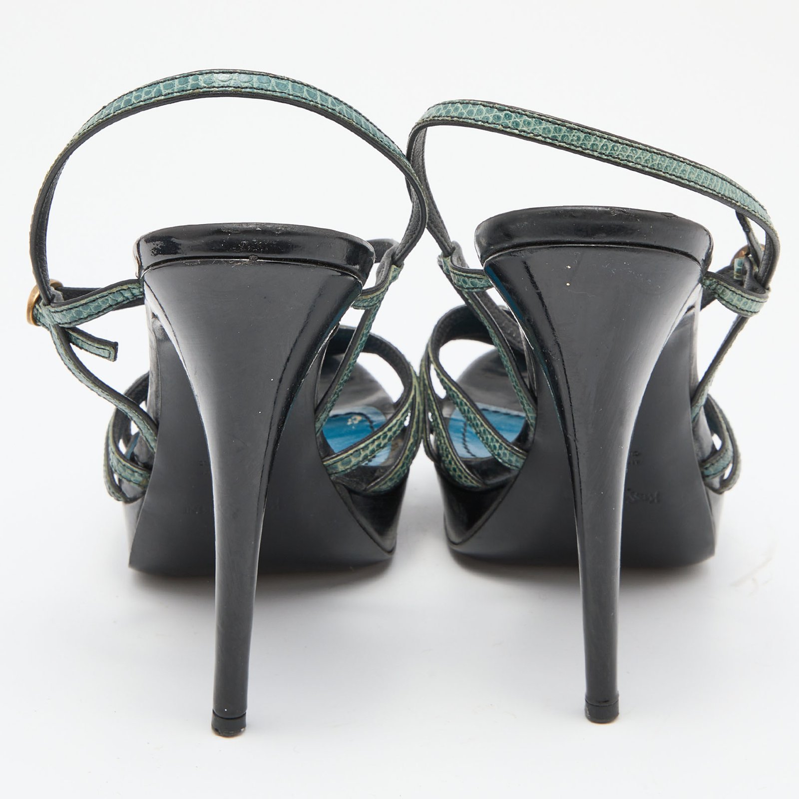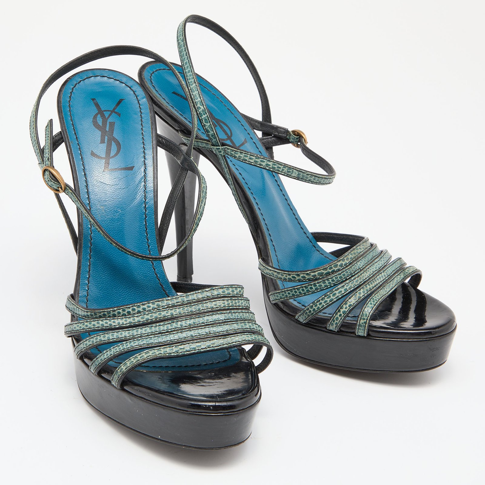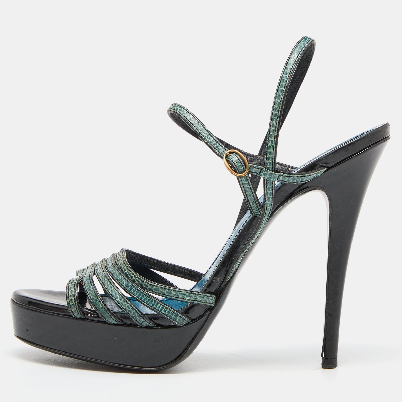 Yves Saint Laurent Green/Black Lizard Strappy Platform Sandals Size 38.5